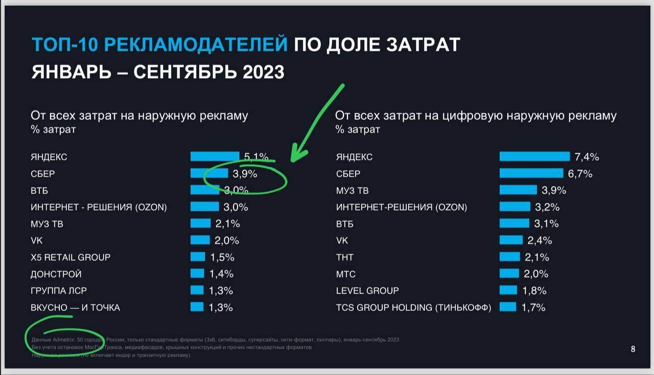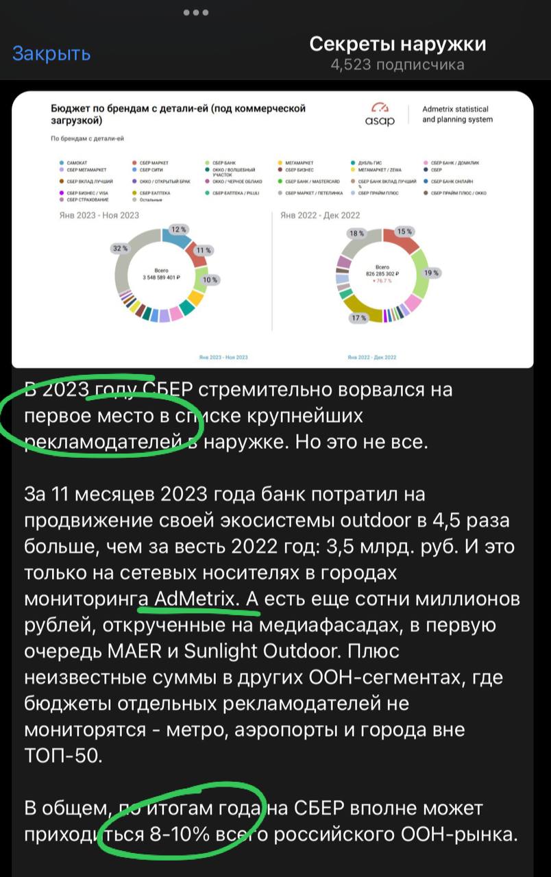 🤓 Коллеги радуются, что за 11 месяцев 2023 Сбер стал первым рекламодателем в наружке (по данным Адметрикс). Говорят еще: «В общем, по итогам года на СБЕР вполне может приходиться 8-10% всего российского OOH-рынка».