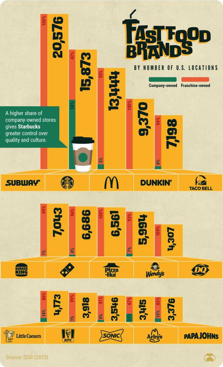 🤓 Сравнительные объемы числа точек сетей общепита в США. Макдоналдс — не первый. Впереди Сабвей. За ним — Старбакс (судя по всему, единственный из «кофеен»).