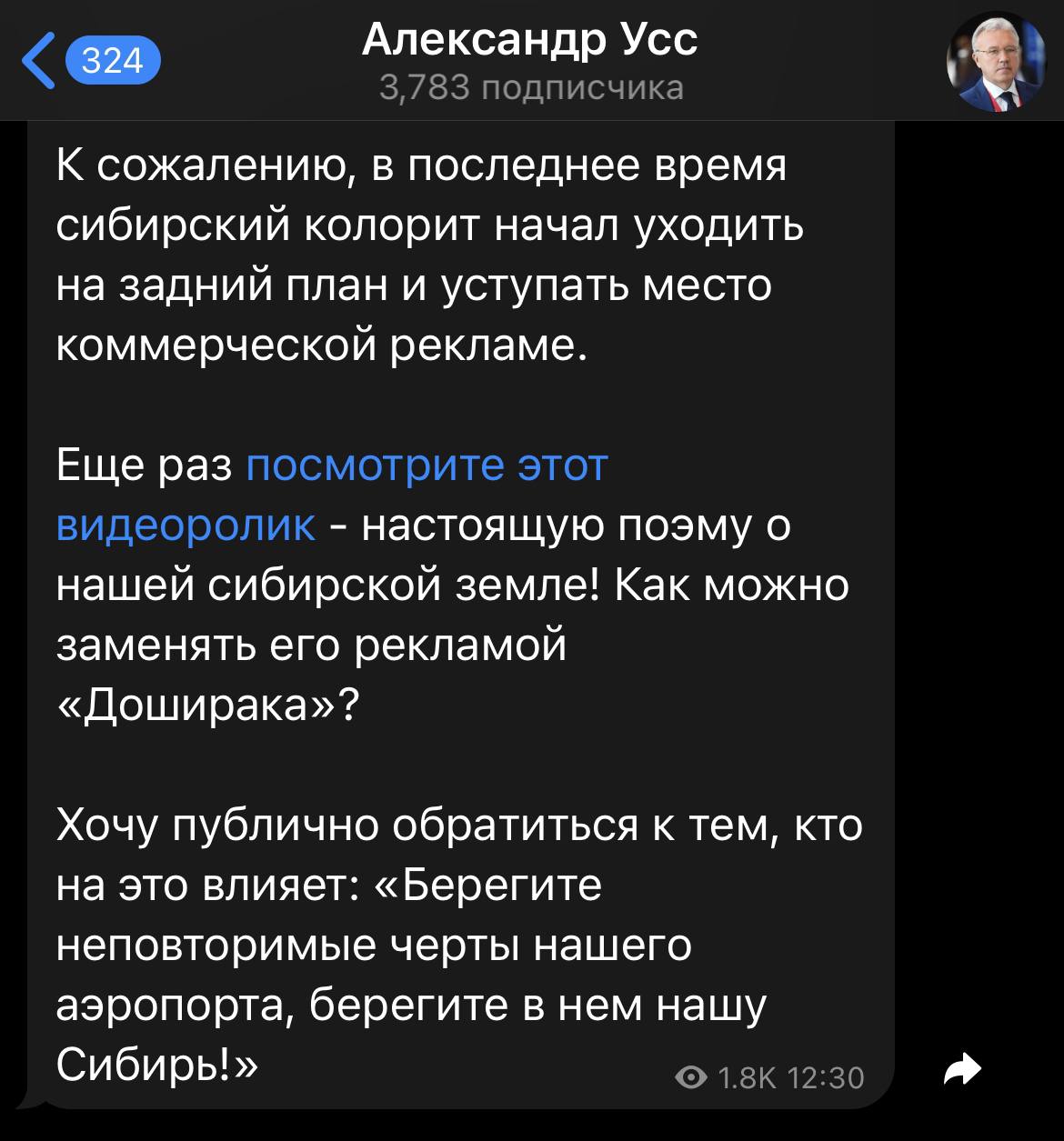 В тг-канале он (бывший губернатор) рекомендовал операторам размещать вместо коммерческой рекламы — красоты Сибири.