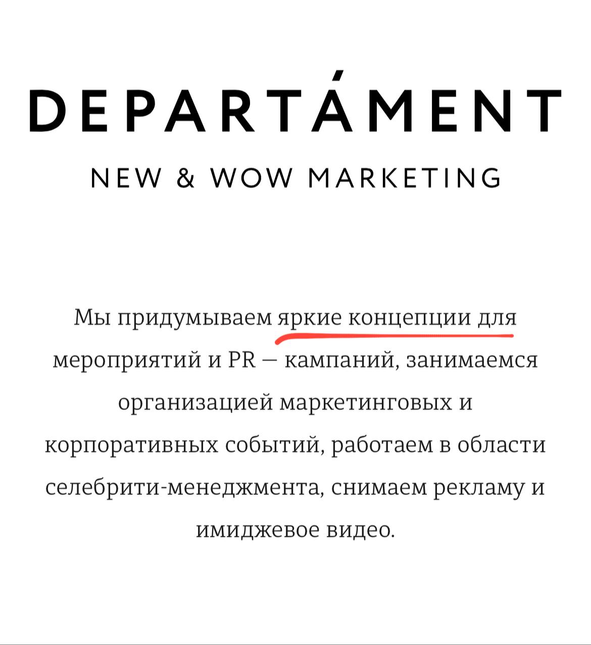 Departament основали Петр Иванов и Павел Недостоев в 2007 году. Команда агентства устраивала ивенты с участием Снуп Догга, Жан-Клода Ван Дамма и Пэрис Хилтон.