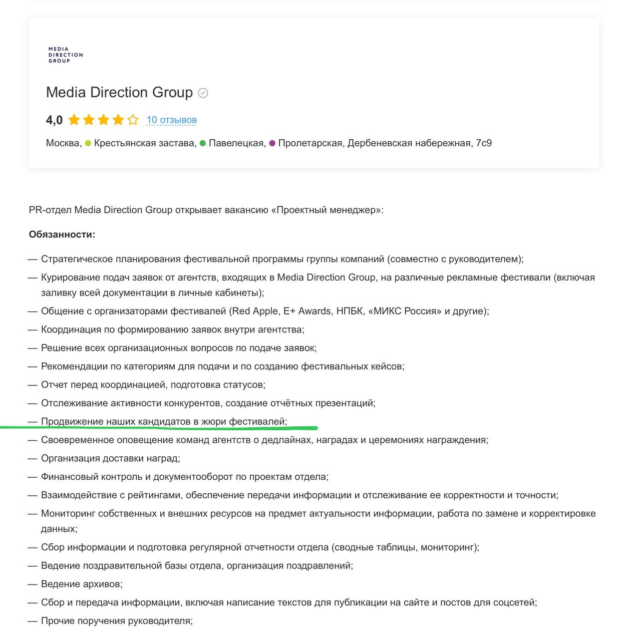 🤓 В Медиа Дирекшн огненная вакансия. Фестивальный менеджер с особой функцией «продвижение наших кандидатов в жюри фестивалей».