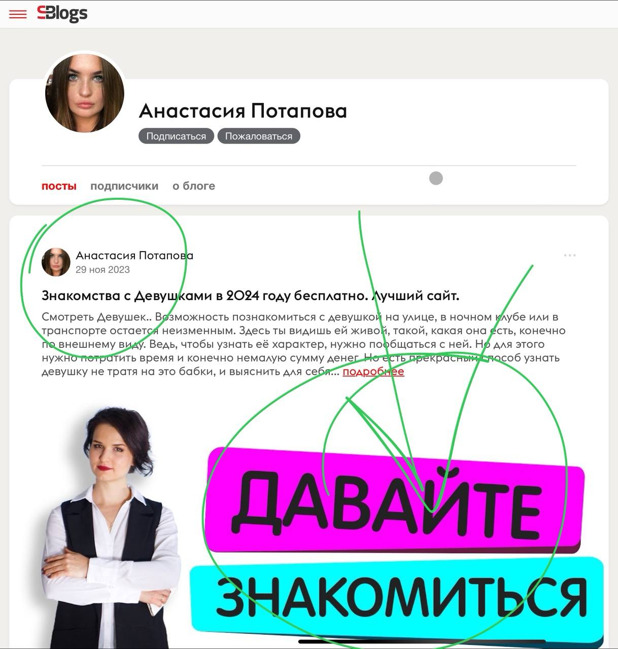 Популярные блоги: ноябрьская Майбродская с одним лайком и нулем комментариев. Аналогично — некто Анастасия Потапова, которая сделала всего один пост «Давайте знакомиться» в ноябре и передумала.