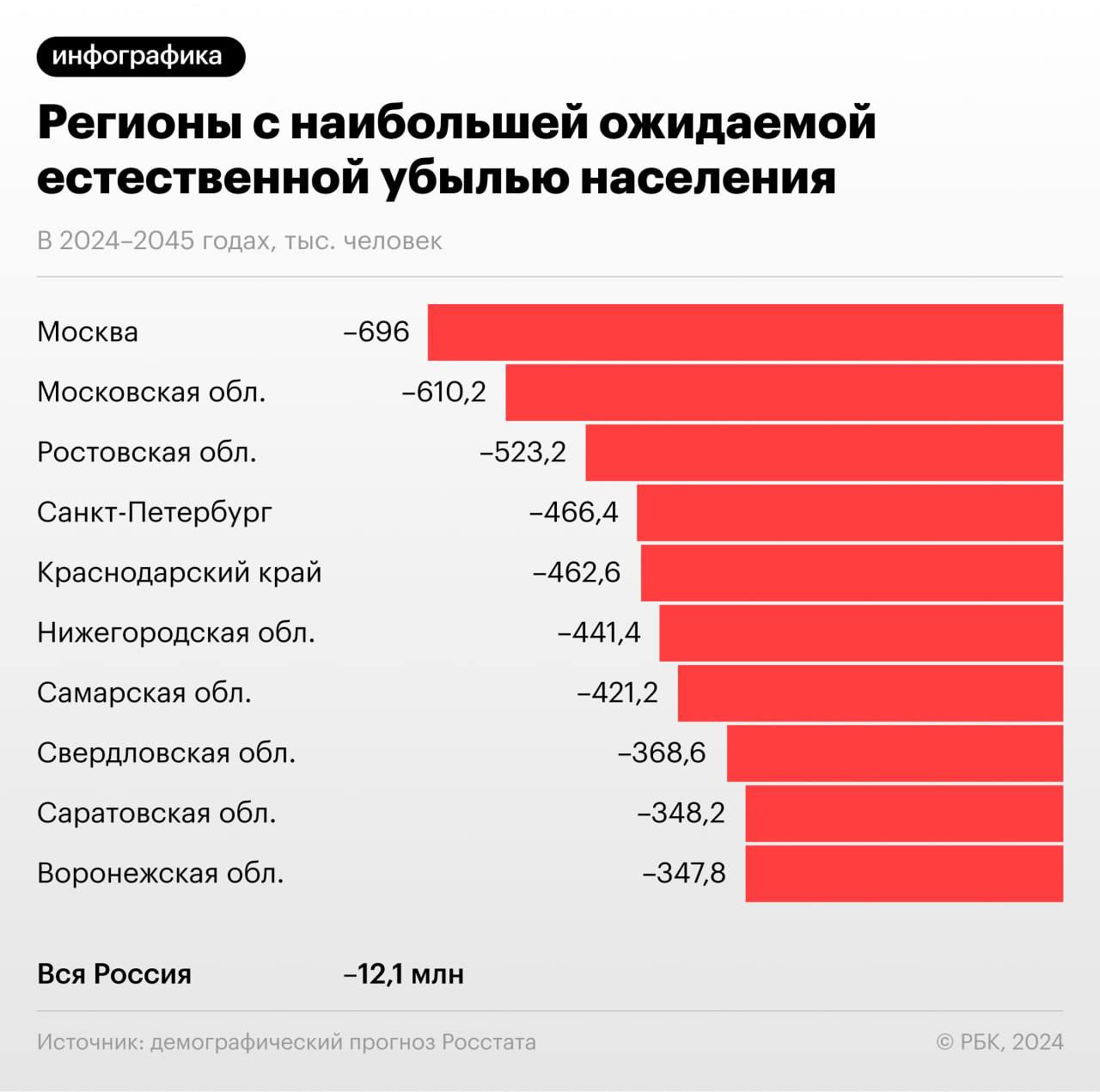 🤓 Прогноз по естественной убыли населения к 2045 году от Росстата — минус 12,1 миллионов человек.