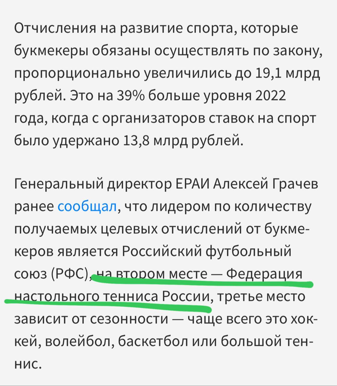 Между тем, доходы российских легальных букмекеров от ставок на спорт в 2023 году выросли на 39% и составили 1,224 трлн рублей, сообщает Форпс.