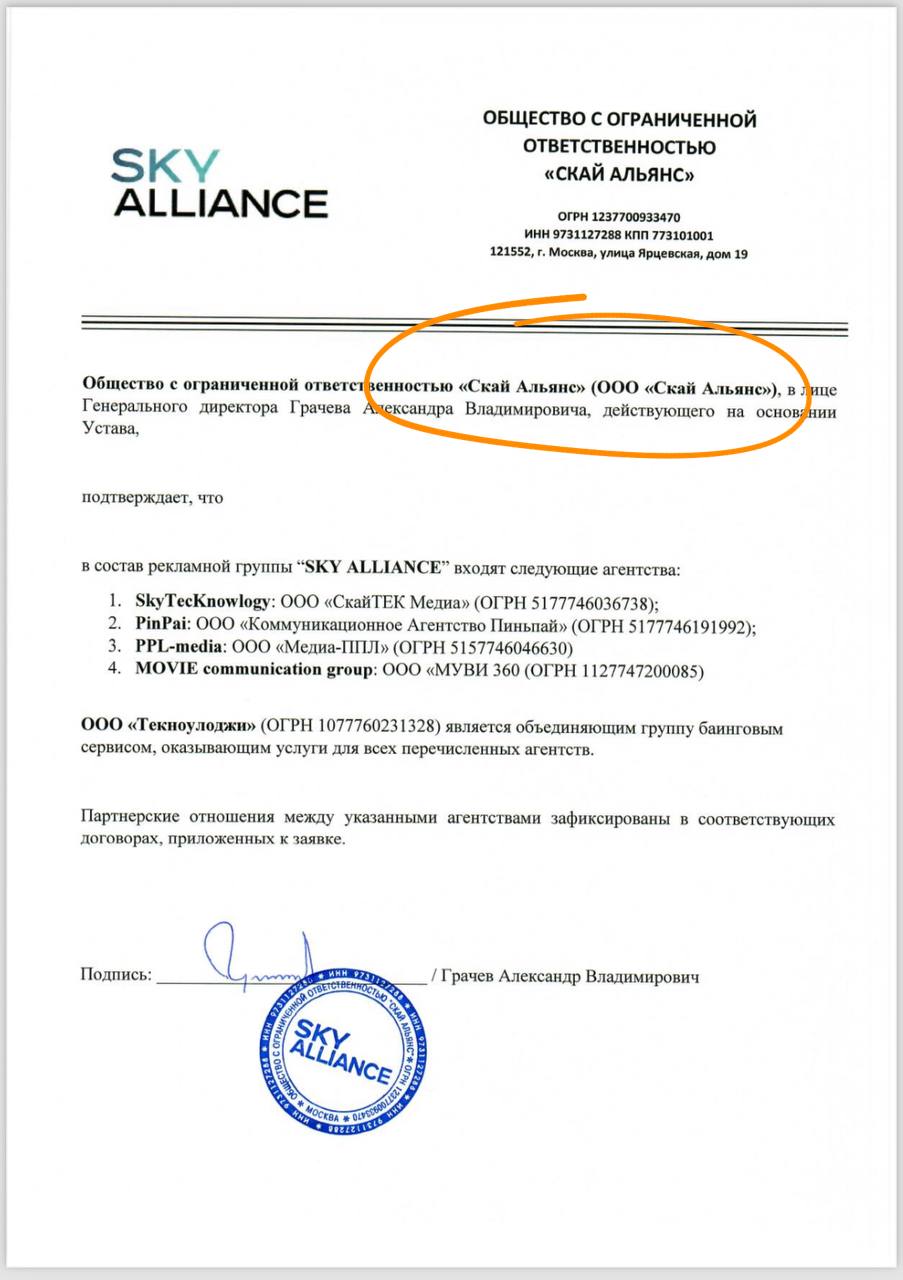 Пикантен тот факт, что юрлицо новой группы ООО «Скай Альянс» создано 25 декабря 2023 года, а приведенное выше письмо — есть заявка на участие в рейтингах этого же года от имени группы.
