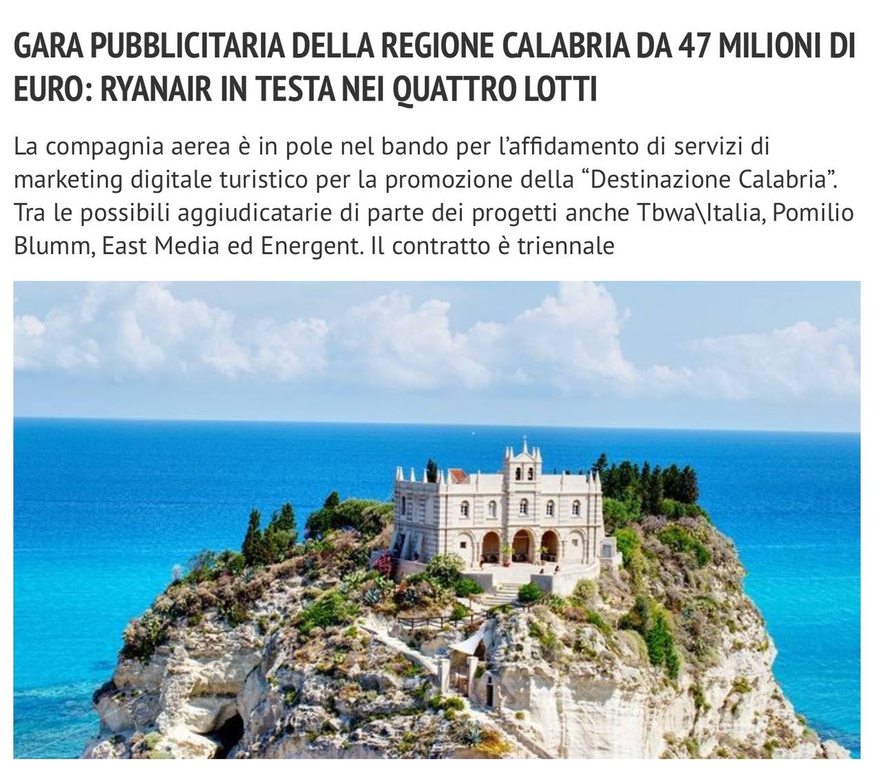 Что случилось? Внутреннее подразделение ирландской авиакомпании-лоукостера Ryanair выиграло тендер на «предоставление услуг по разработке концепции и управлению кампаниями цифрового маркетинга с целью укрепления имиджа итальянского региона Калабрии на национальном и международном рынках, а также стимулирования новых туристических потоков». В статусе — рекламного агентства.