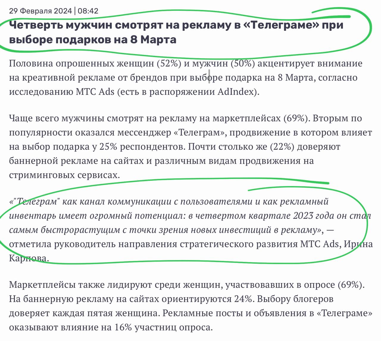 🤓 «Четверть мужчин смотрят на рекламу в «Телеграме» при выборе подарков на 8 Марта» — сообщает нам МТС (они сделали исследование). Что за бред, подумали мы? Но, приложив плоское к зеленому, все поняли. Кто у нас больше всех хочет продавать рекламу в Телеграме через свой МТС Маркетолог? Мы бы рекомендовали коллегам двигать свою амбицию менее грубо, что ли…