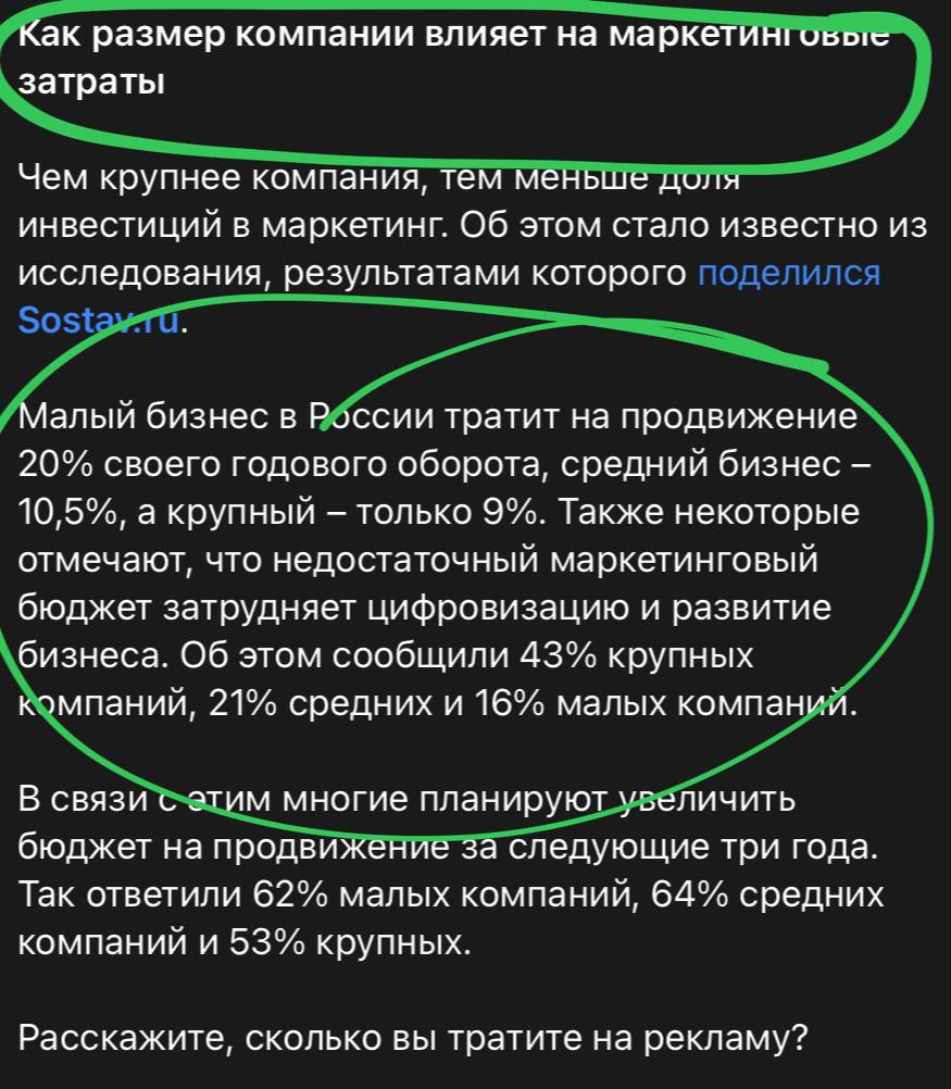 Говорящая цитата: «По мере роста бизнеса размер инвестиций в маркетинг снижается. В прошлом году малые компании вложили в продвижение 20% от своего годового оборота, средние — 10,5%, крупные — 9%.»