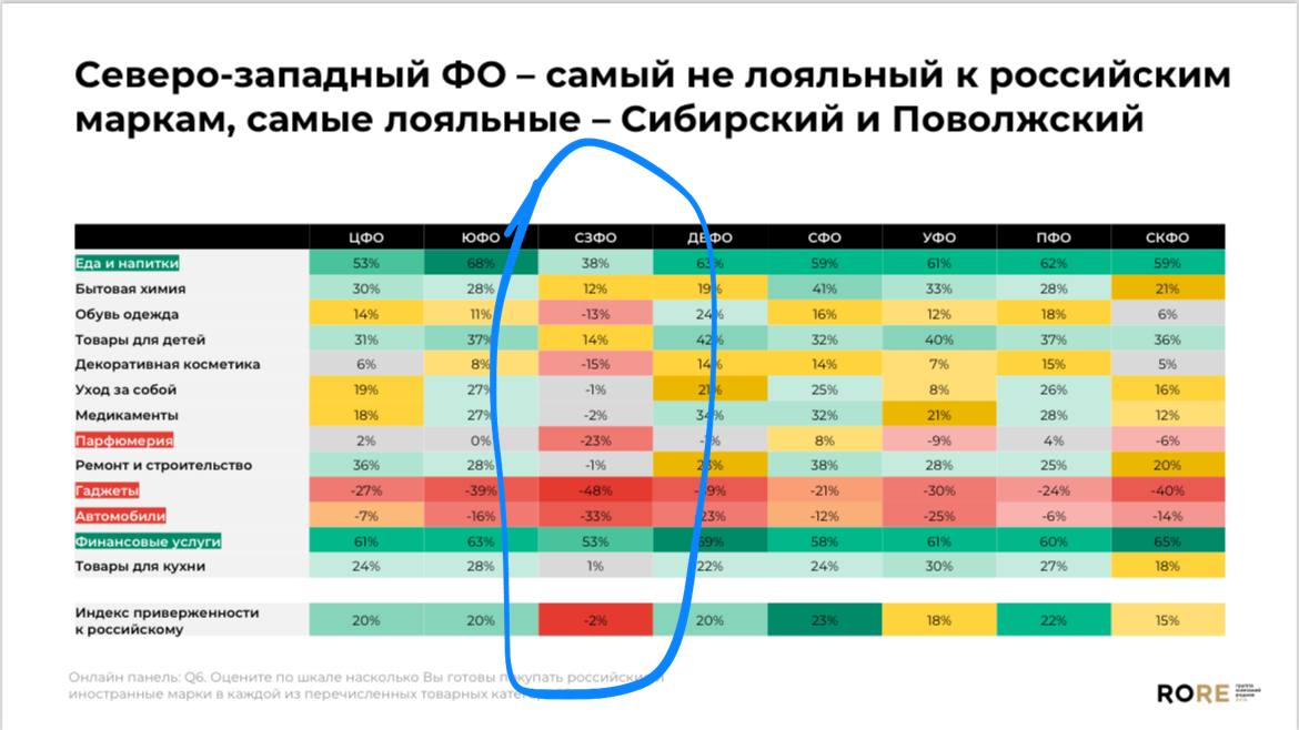 1. Как регионы воспринимают потенциал отечественных брендах в товарных категориях? Ожидаемо — максимум снобства в Питере.