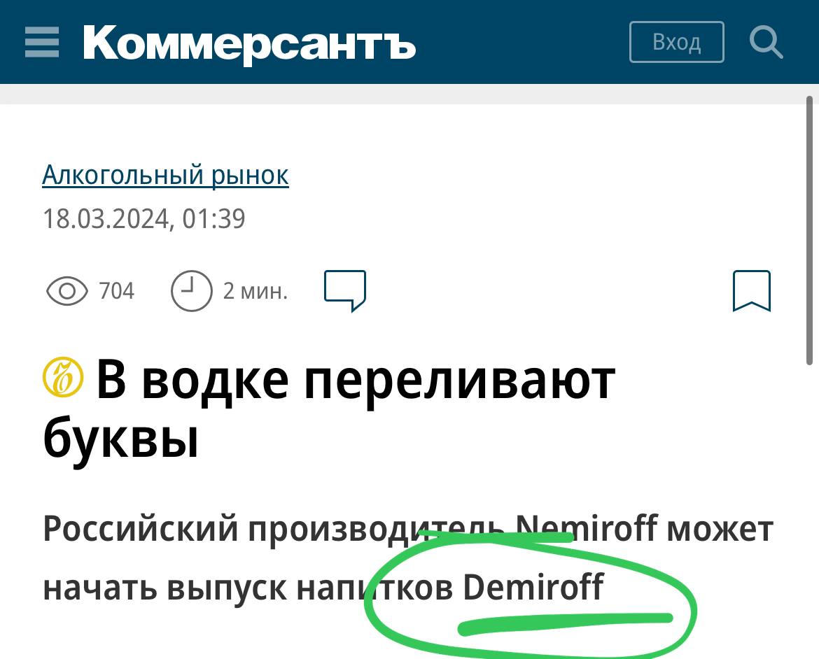«Производитель водки и настойки Nemiroff, после требования владельца бренда в суде отказаться от марки задумались о запуске напитков Demiroff.»