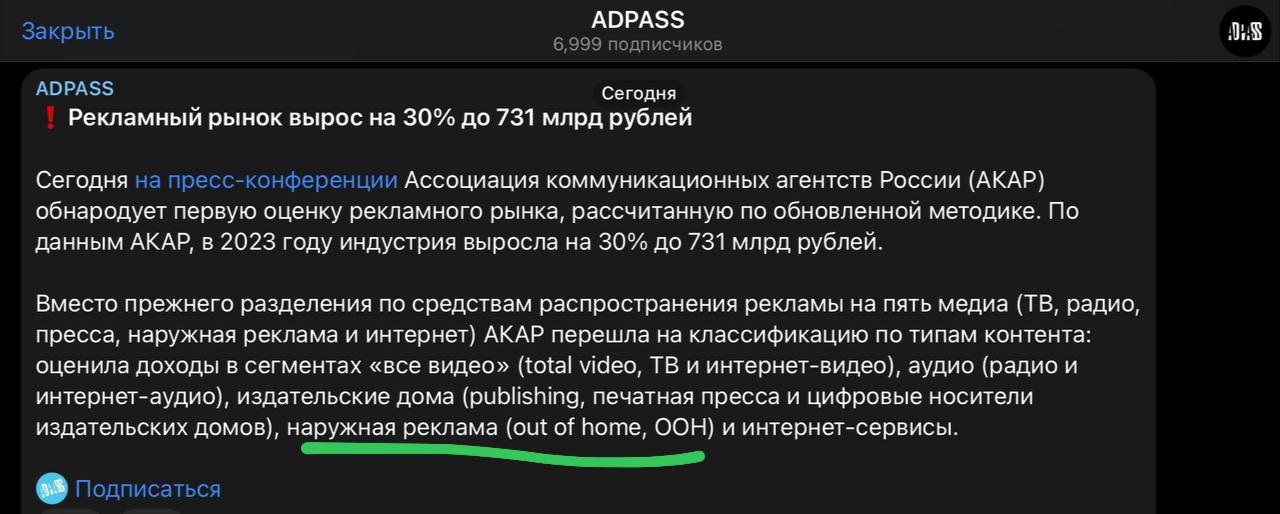 😬 Новая методика оценки рекламного рынка АКАР заключается в разделении наружной рекламы на out of home и OOH-медиа. Согласно данным ADPASS☝🏻.