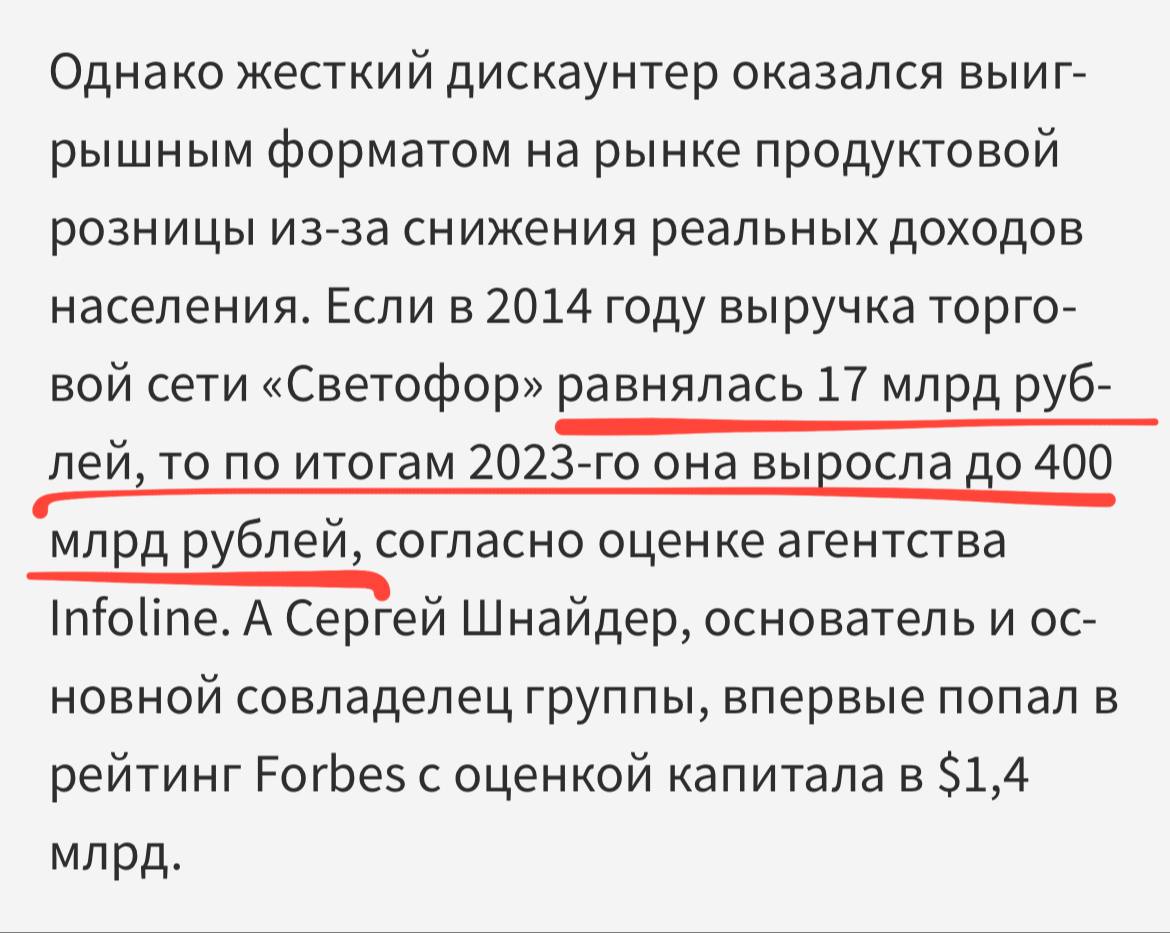 Forbes оценил состояние 57-летнего Сергея Шнайдера в $1,4 млрд. В последние годы группа «Светофор» была одной из самых быстрорастущих торговых сетей и вошла в топ-5 продуктовых сетей России.