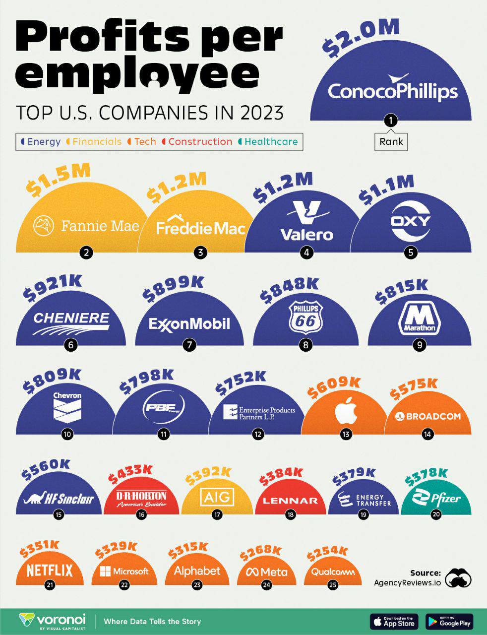 🤓 Любопытная иллюстрация. В ТОПе компаний США по прибыли на одного сотрудника — НЕТ компаний из сектора Услуги/B2C.
