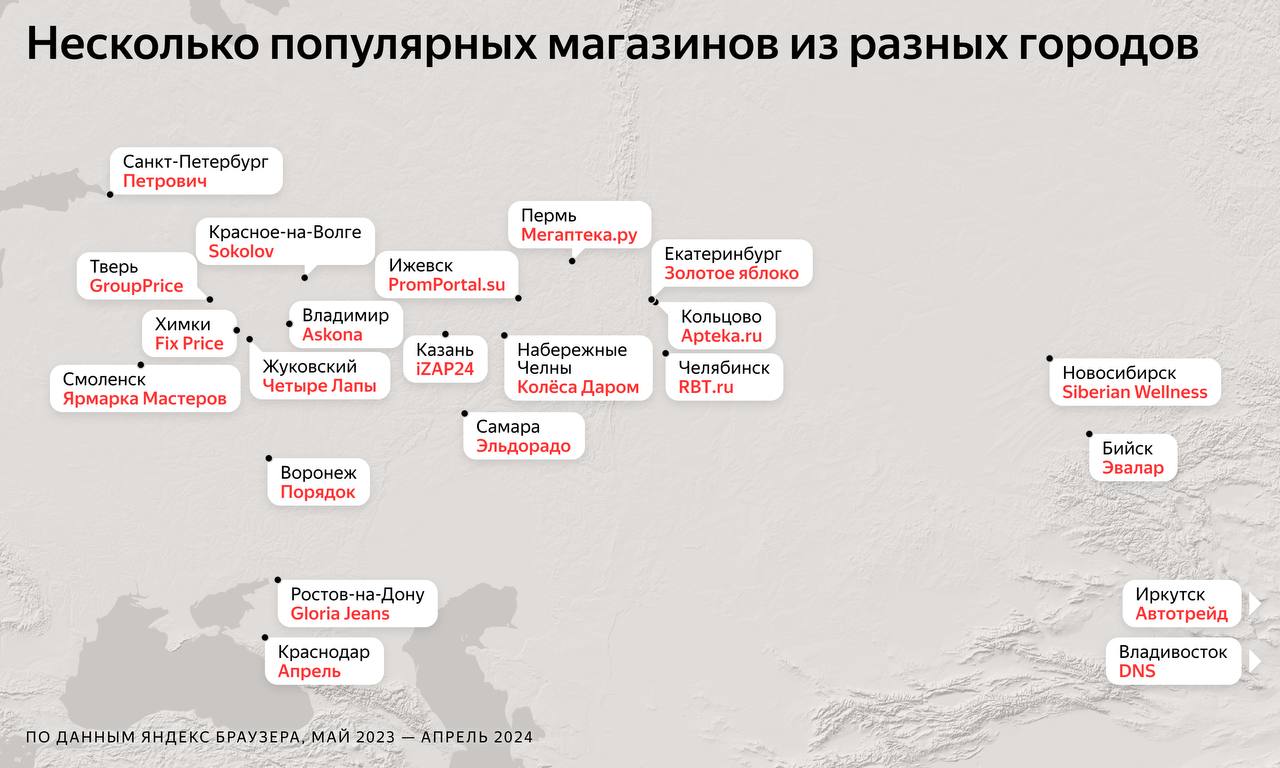 🤓 Не Москвою единой... Яндекс популяризирует идею регионального предпринимательства через демонстрацию карты происхождения китов отечественного онлайн-ритейла.