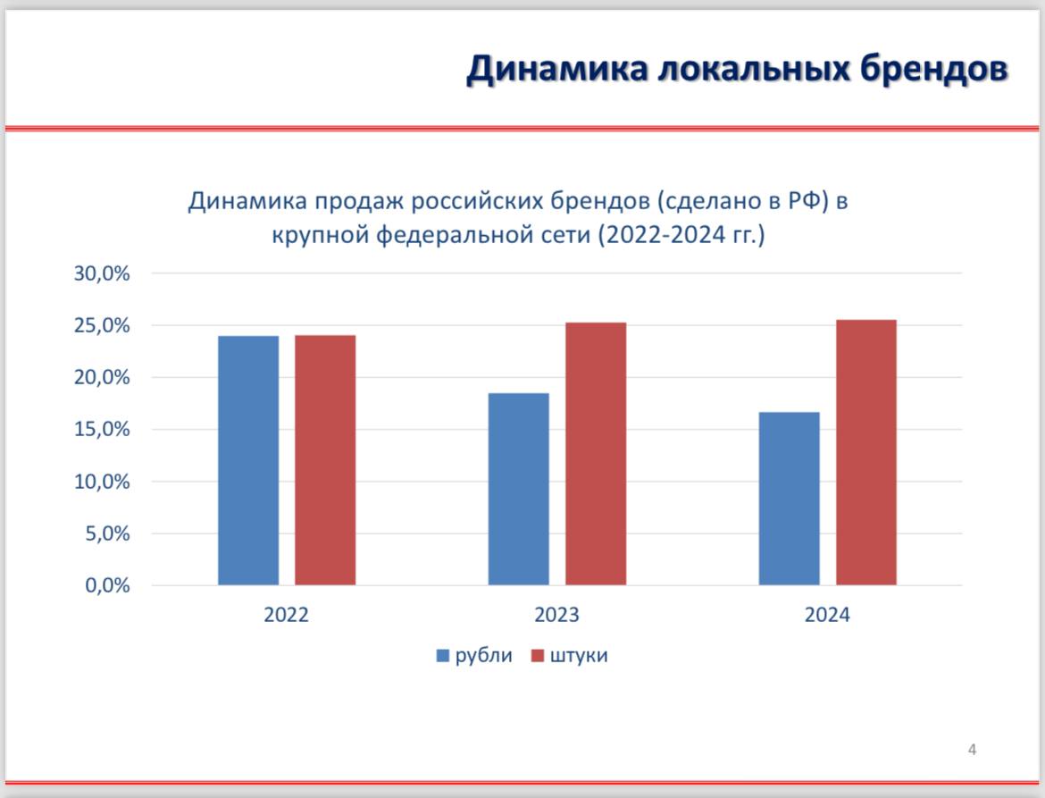 — Доля продаж в единицах российских брендов [в их сети] почти не растет с 2022 года.