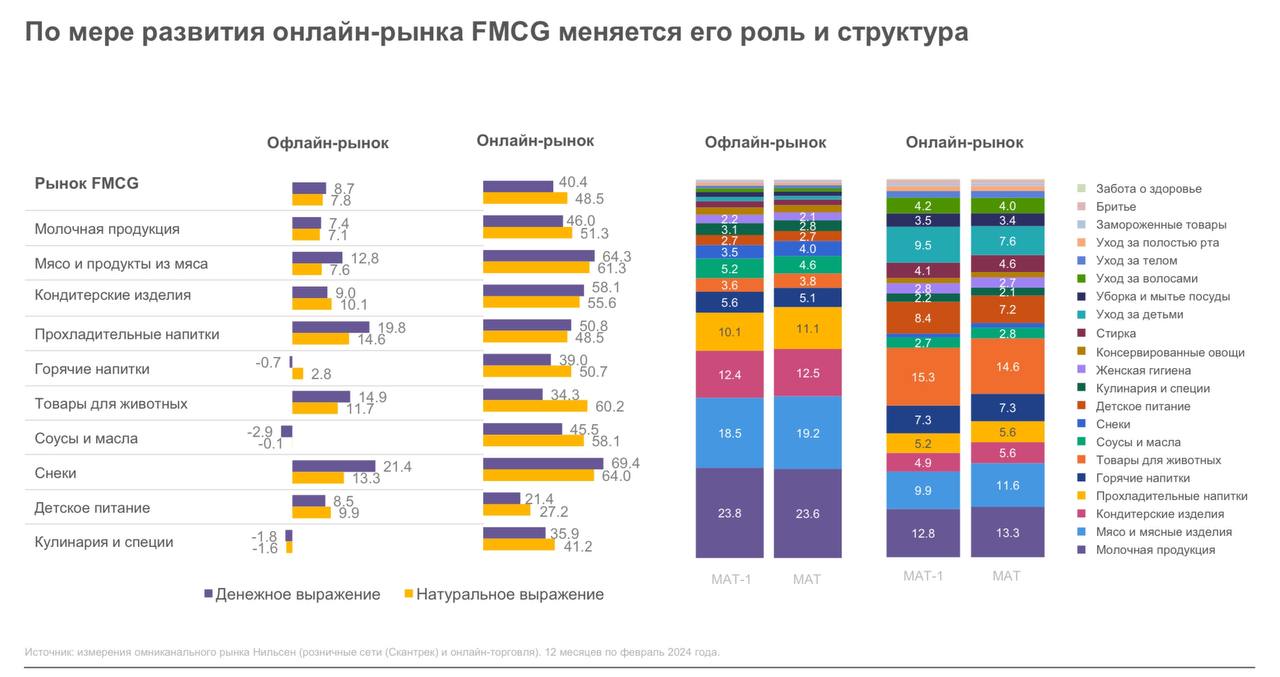 🤓 Два слайда от Nielsen, рассказывающих нам о том, что офлайн и онлайн в ритейле — это два разных бизнеса, две отдельных планеты.