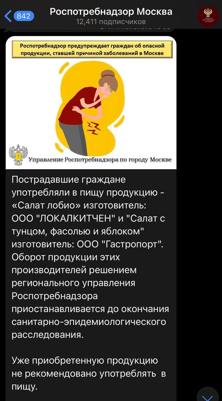 🤓 Роспотребнадзор подозревает, что причиной вспышки ботулизма мог стать салат из Вкусвилла и Кухни на районе.