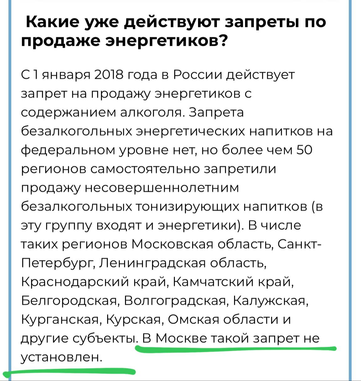 🤓 Вы удивитесь, но запрета на продажу энергетиков детям сегодня в России нет. Есть различные ограничения, действующие на уровне регионов. В Москве, например, продажа детям — разрешена.
