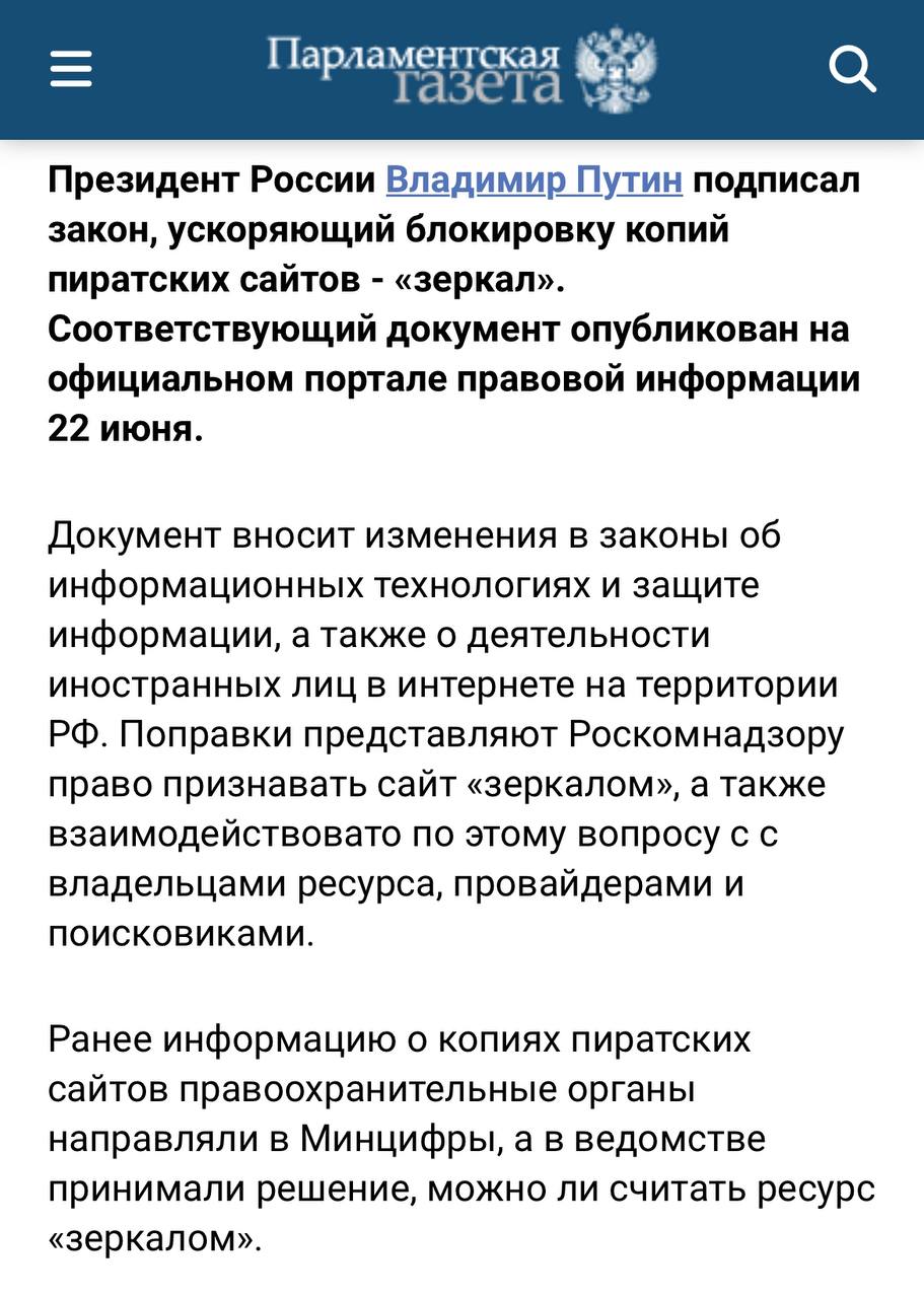 😮 Внезапно. Указом Президента пиратские сайты (и их клоны) можно блокировать без суда и следствия. Вступило в силу со дня подписания.