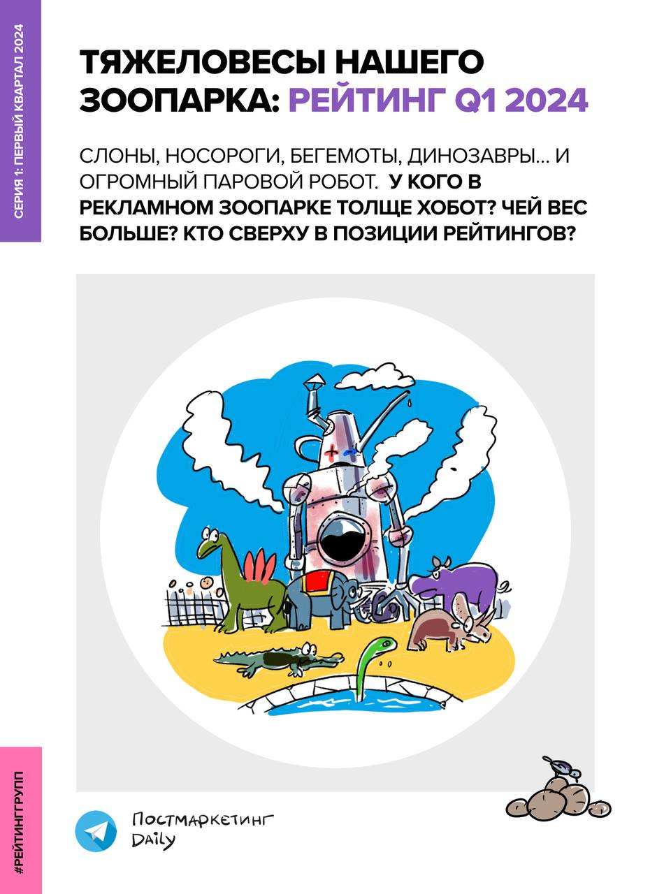 Назвали мы проект «Тяжеловесы нашего зоопарка Q1 2024».У кого в рекламном зоопарке толще хобот? Чей вес больше? Кто сверху в позиции рейтингов?