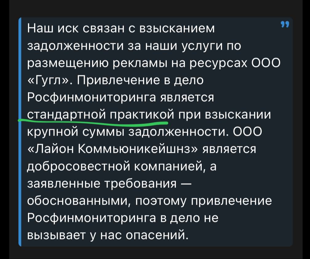 ΠΡΠΈΠ²Π»Π΅ΡΠ΅Π½ΠΈΠ΅ Π² Π΄Π΅Π»ΠΎ Π ΠΎΡΡΠΈΠ½ΠΌΠΎΠ½ΠΈΡΠΎΡΠΈΠ½Π³Π° ΡΠ²Π»ΡΠ΅ΡΡΡ ΡΡΠ°Π½Π΄Π°ΡΡΠ½ΠΎΠΉ ΠΏΡΠ°ΠΊΡΠΈΠΊΠΎΠΉ ΠΏΡΠΈ Π²Π·ΡΡΠΊΠ°Π½ΠΈΠΈ ΠΊΡΡΠΏΠ½ΠΎΠΉ ΡΡΠΌΠΌΡ Π·Π°Π΄ΠΎΠ»ΠΆΠ΅Π½Π½ΠΎΡΡΠΈ. ΠΠΠ «ΠΠ°ΠΉΠΎΠ½ ΠΠΎΠΌΠΌΡΡΠ½ΠΈΠΊΠ΅ΠΉΡΠ½Π·» ΡΠ²Π»ΡΠ΅ΡΡΡ Π΄ΠΎΠ±ΡΠΎΡΠΎΠ²Π΅ΡΡΠ½ΠΎΠΉ ΠΊΠΎΠΌΠΏΠ°Π½ΠΈΠ΅ΠΉ, Π° Π·Π°ΡΠ²Π»Π΅Π½Π½ΡΠ΅ ΡΡΠ΅Π±ΠΎΠ²Π°Π½ΠΈΡ — ΠΎΠ±ΠΎΡΠ½ΠΎΠ²Π°Π½Π½ΡΠΌΠΈ, ΠΏΠΎΡΡΠΎΠΌΡ ΠΏΡΠΈΠ²Π»Π΅ΡΠ΅Π½ΠΈΠ΅ Π ΠΎΡΡΠΈΠ½ΠΌΠΎΠ½ΠΈΡΠΎΡΠΈΠ½Π³Π° Π² Π΄Π΅Π»ΠΎ Π½Π΅ Π²ΡΠ·ΡΠ²Π°Π΅Ρ Ρ Π½Π°Ρ ΠΎΠΏΠ°ΡΠ΅Π½ΠΈΠΉ.»
