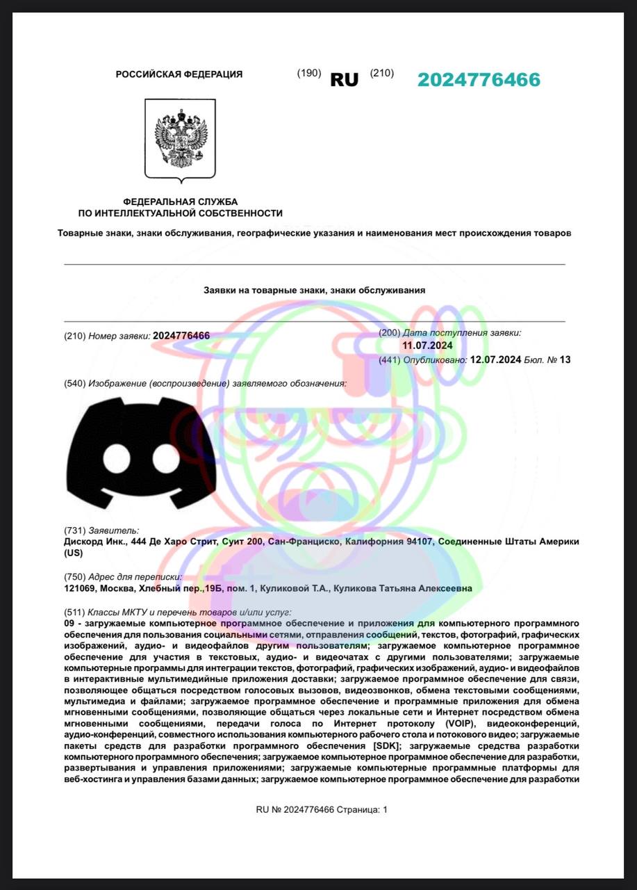 🤓 Американская корпорация Дискорд регистрирует одноименный товарный знак в российском патентном ведомстве.