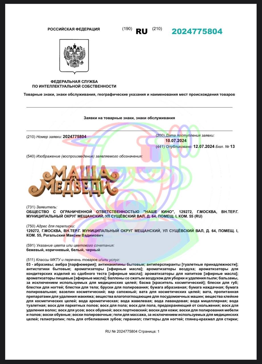 🤓 Некто с названием ООО «Наше кино» регистрирует нечто с названием «Маша Медведи». Небось клон, пытаются повторить успех.