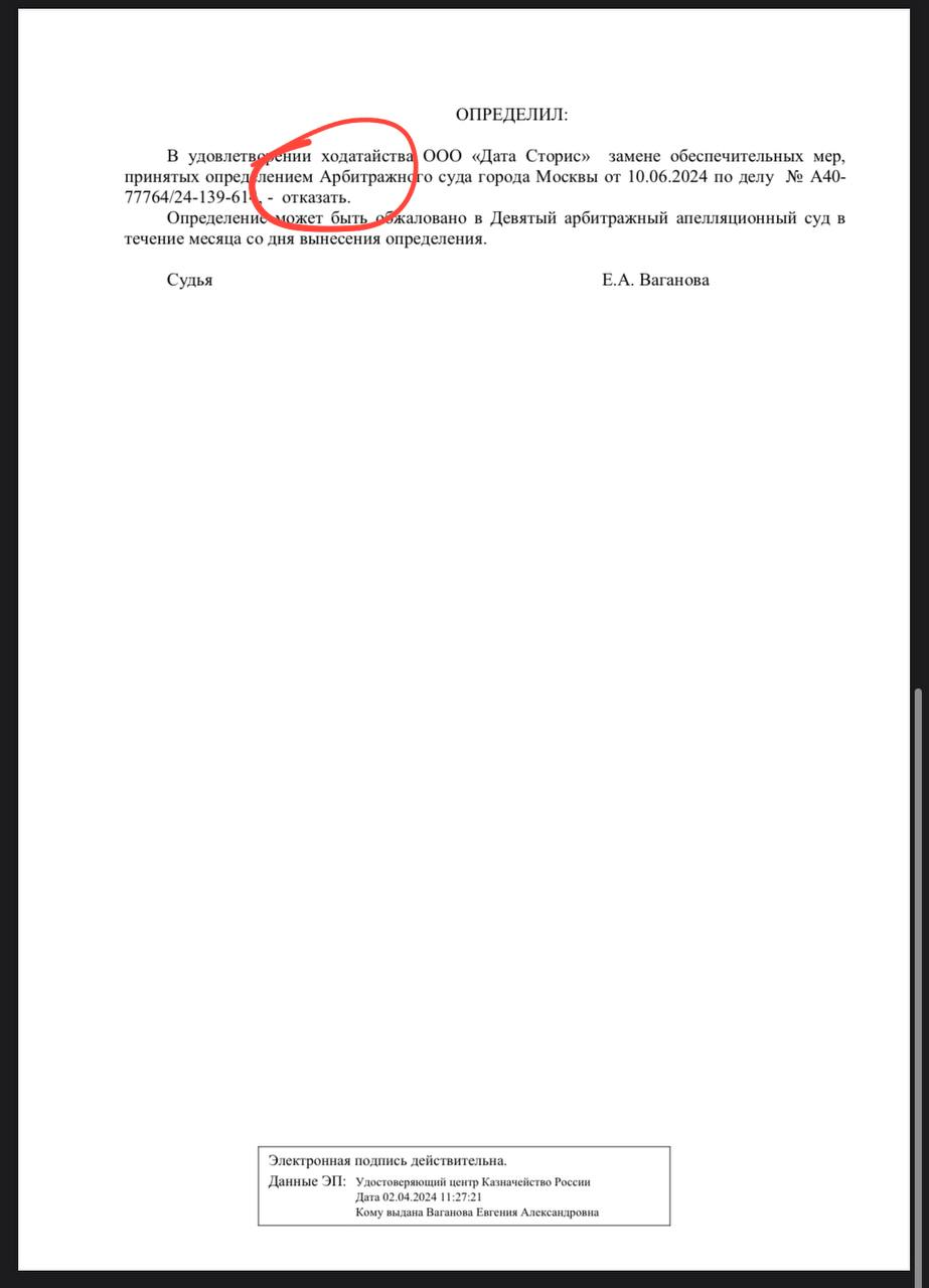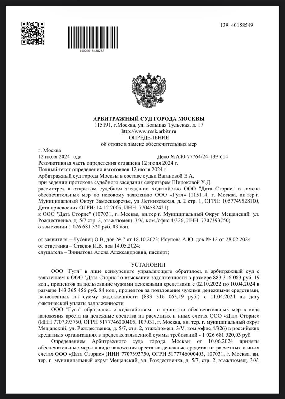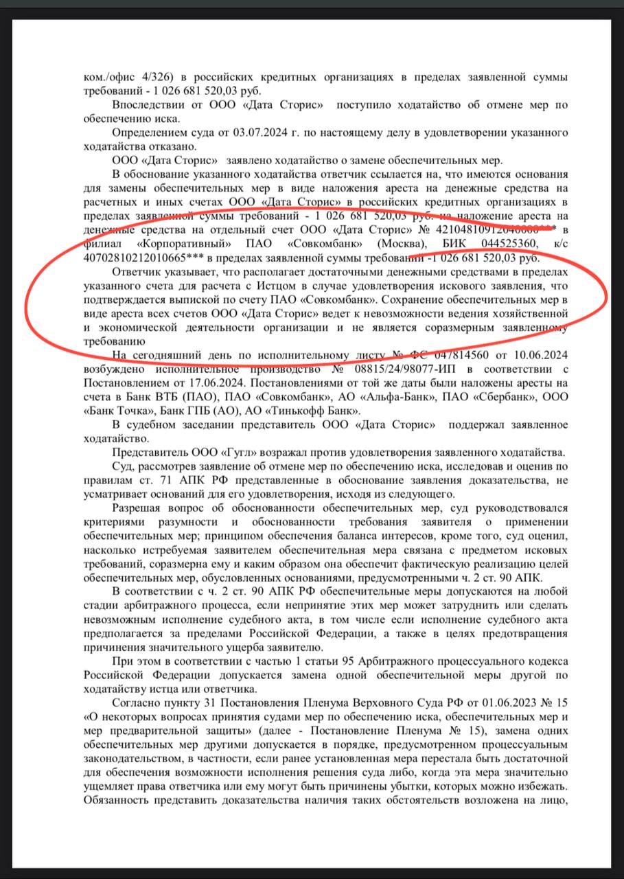🤓 На днях ООО «Дата сториз» (Эмджиком) пыталось аппелировать в суде относительно ареста счетов в обеспечение иска Гугля — «арест ведет к невозможности хозяйственной и экономической деятельности организации», но суд к аргументам ответчика не прислушался…