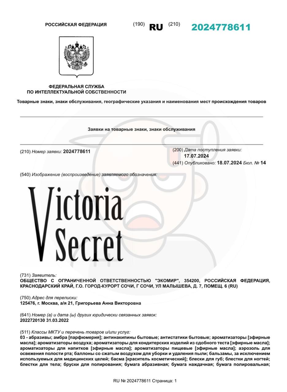 ООО из города Сочи пытается экспроприировать товарный знак Виктория Сикрет для множественных категорий.