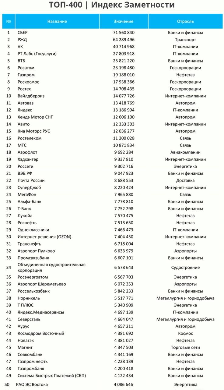 Система мониторинга и анализа СМИ и соцмедиа «СКАН-Интерфакс» совместно с Российской ассоциацией по связям с общественностью (РАСО) подготовили очередной медиарейтинг ТОП-400 российских компаний и организаций по величине Индекса Заметности в СМИ.