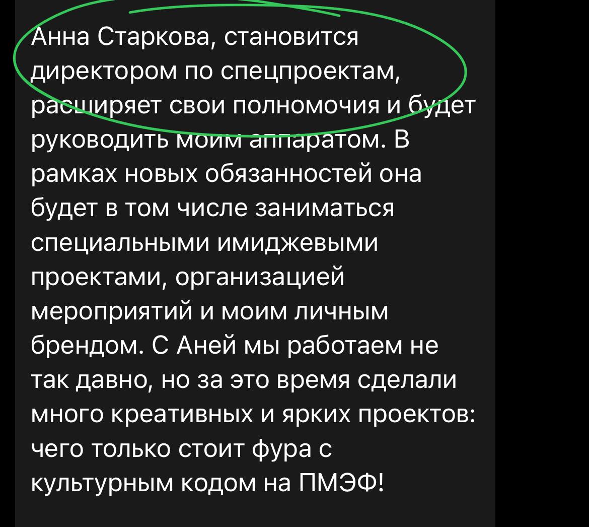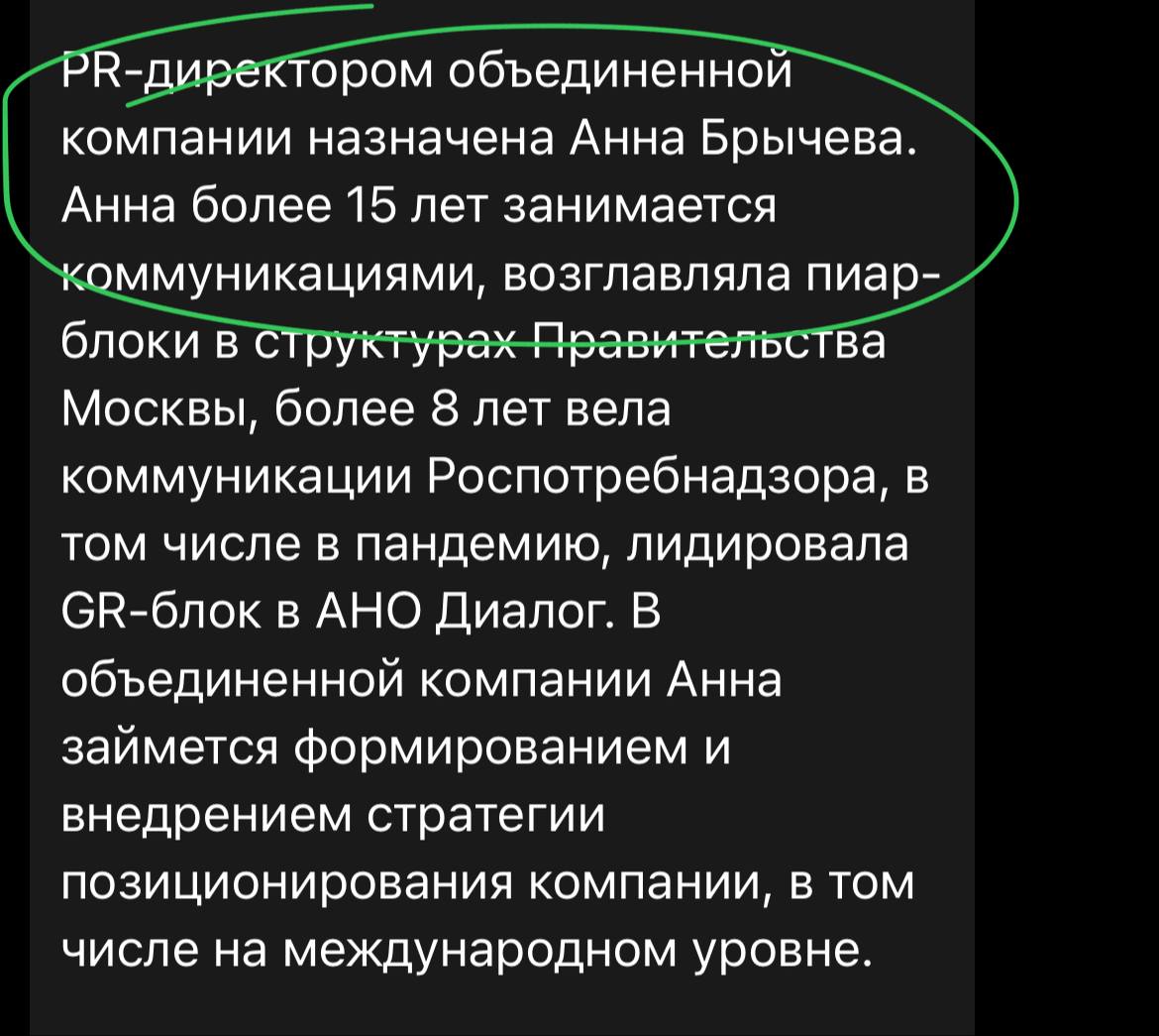 Остальные PR-позиции займут профессионалы с рынка иной квалификации («возглавляла пиар-блоки в структурах Правительства Москвы, более 8 лет вела коммуникации Роспотребнадзора, в том числе в пандемию, лидировала GR-блок в АНО Диалог») и персонал RUSS.