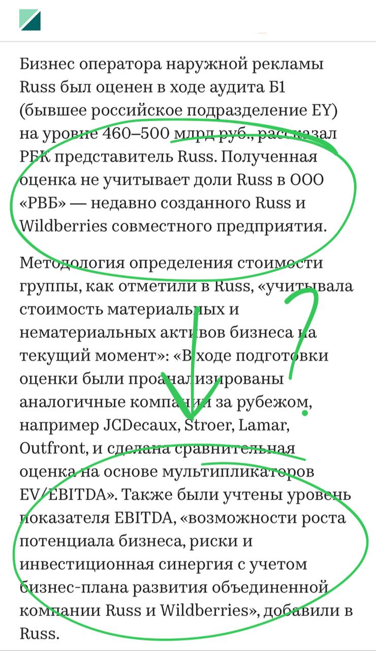 🤓 B1 (бывший Эрнст энд Янг) насчитал какую-то парадоксальную муть. По их данным стоимость бизнеса RUSS составляет порядка 500 миллиардов рублей, на фоне оборота 38 ярдов и прибыли 7 в 2023 году. Мультипликатор к прибыли Х70.