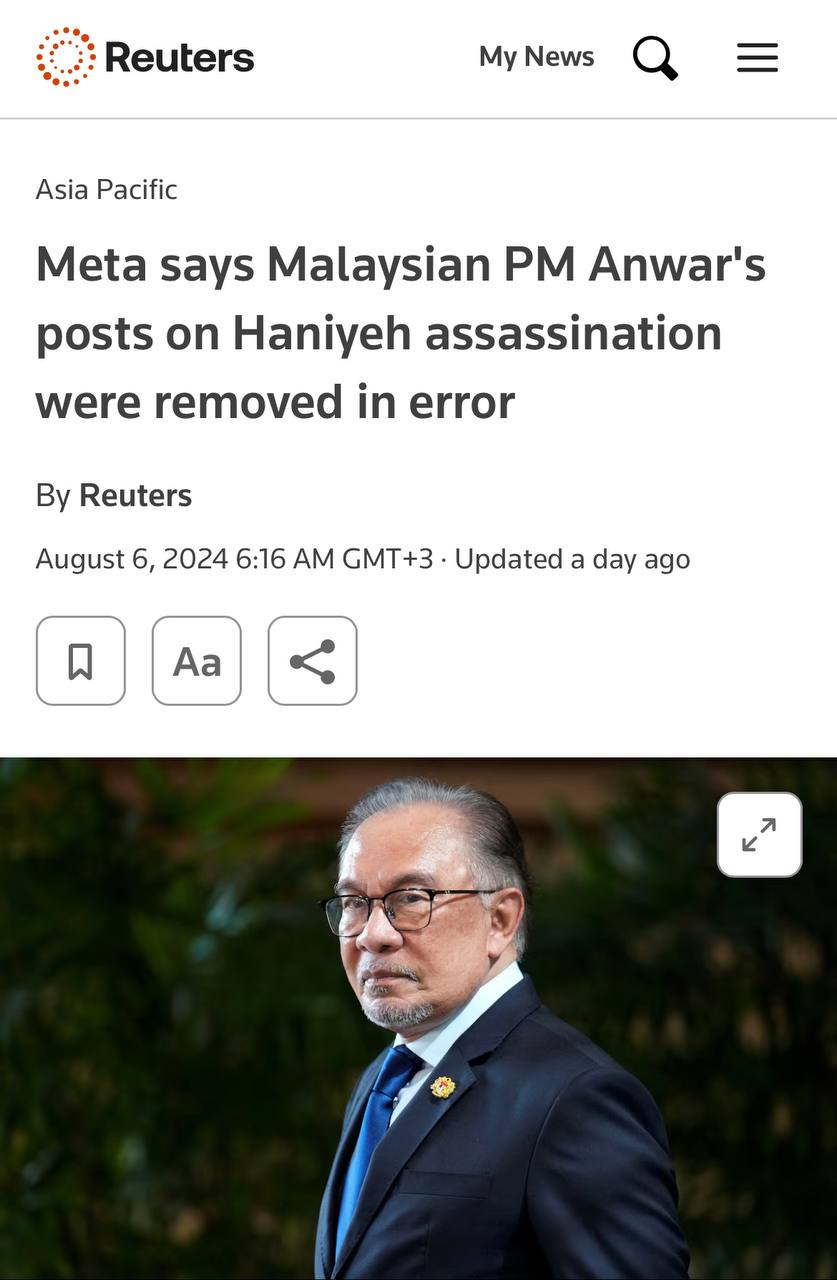 Meta (еще раз— экстремисты, запрещены) принесла извинения за удаление постов премьер-министра Малайзии и восстановила его посты.