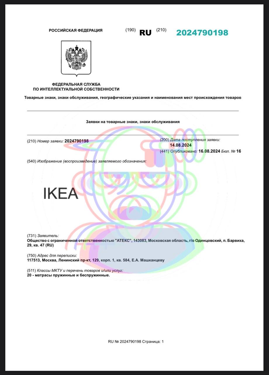 🤓 Безымянный житель Барвихи пытается зарегистрировать товарный знак IKEA на свое ООО в профильной для шведского гиганта категории — «матрасы».