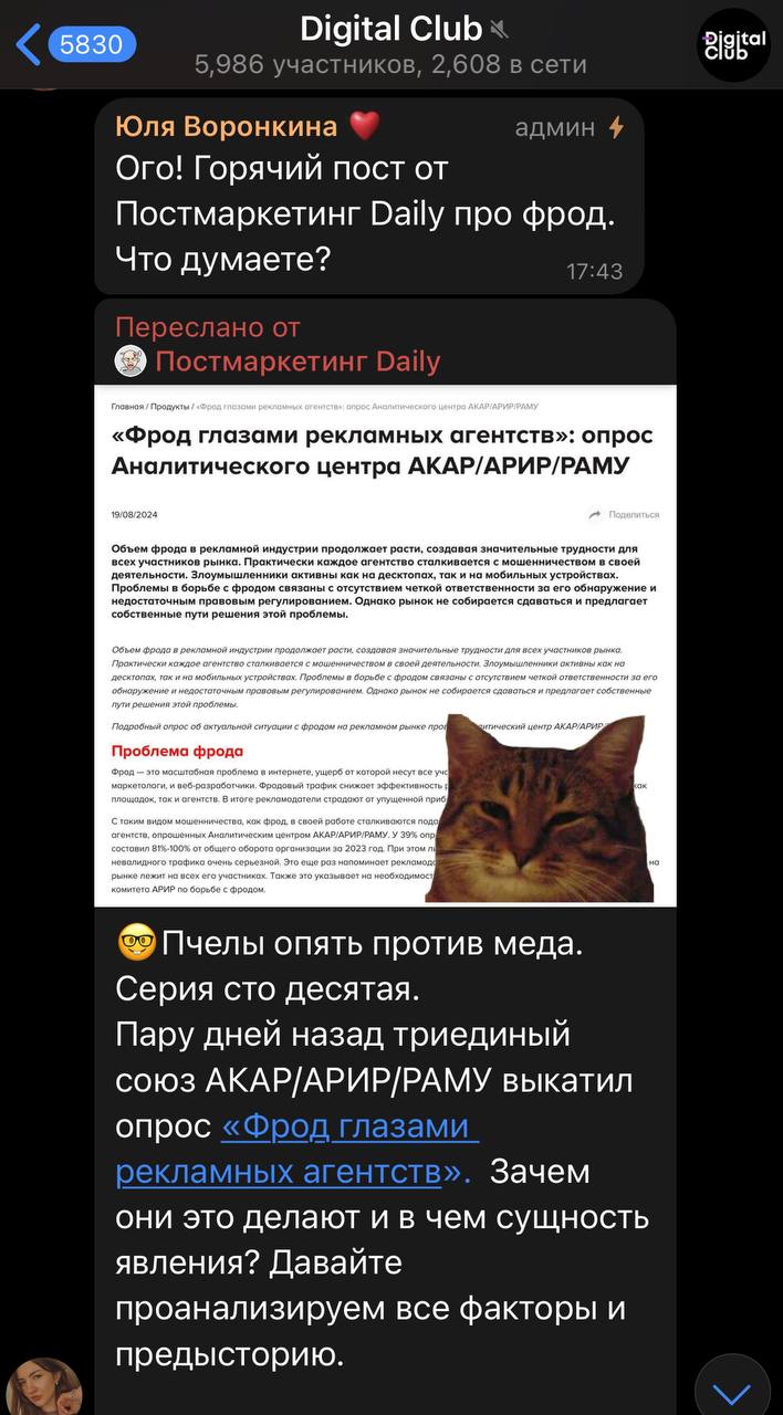 🤓 А вот — лучшие цитаты из обсуждения нашего поста про пчел, которые против фрода, на дружественной площадке Digital Club. Мы рады, что в значительной степени мнение редакции совпадает с позицией участников рынка.