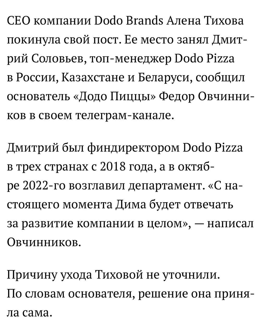 Летом 2023 года Тихова вернулась в Москву. К тому моменту Федор Овчинников объявил о планах оставить позицию генерального директора Dodo Brands и назвал Алену своей преемницей.