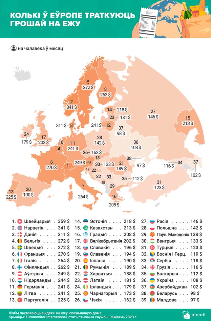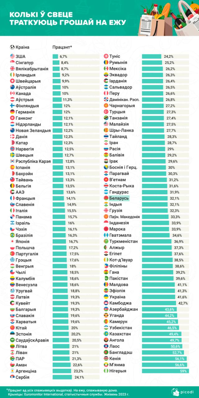 🤓 Интересная прошлогодняя табличка на белорусском — какую долю от дохода тратят на еду в странах мира