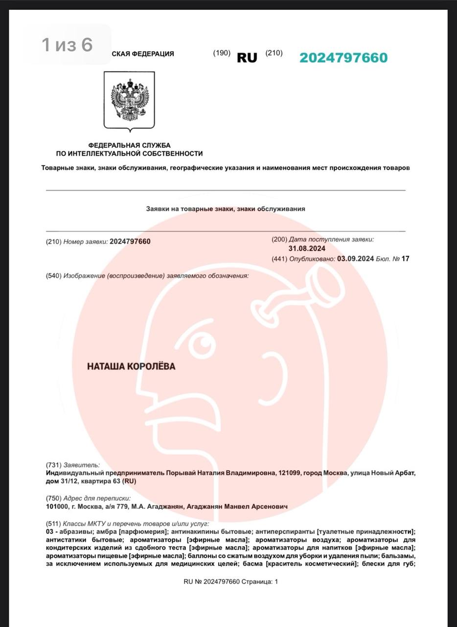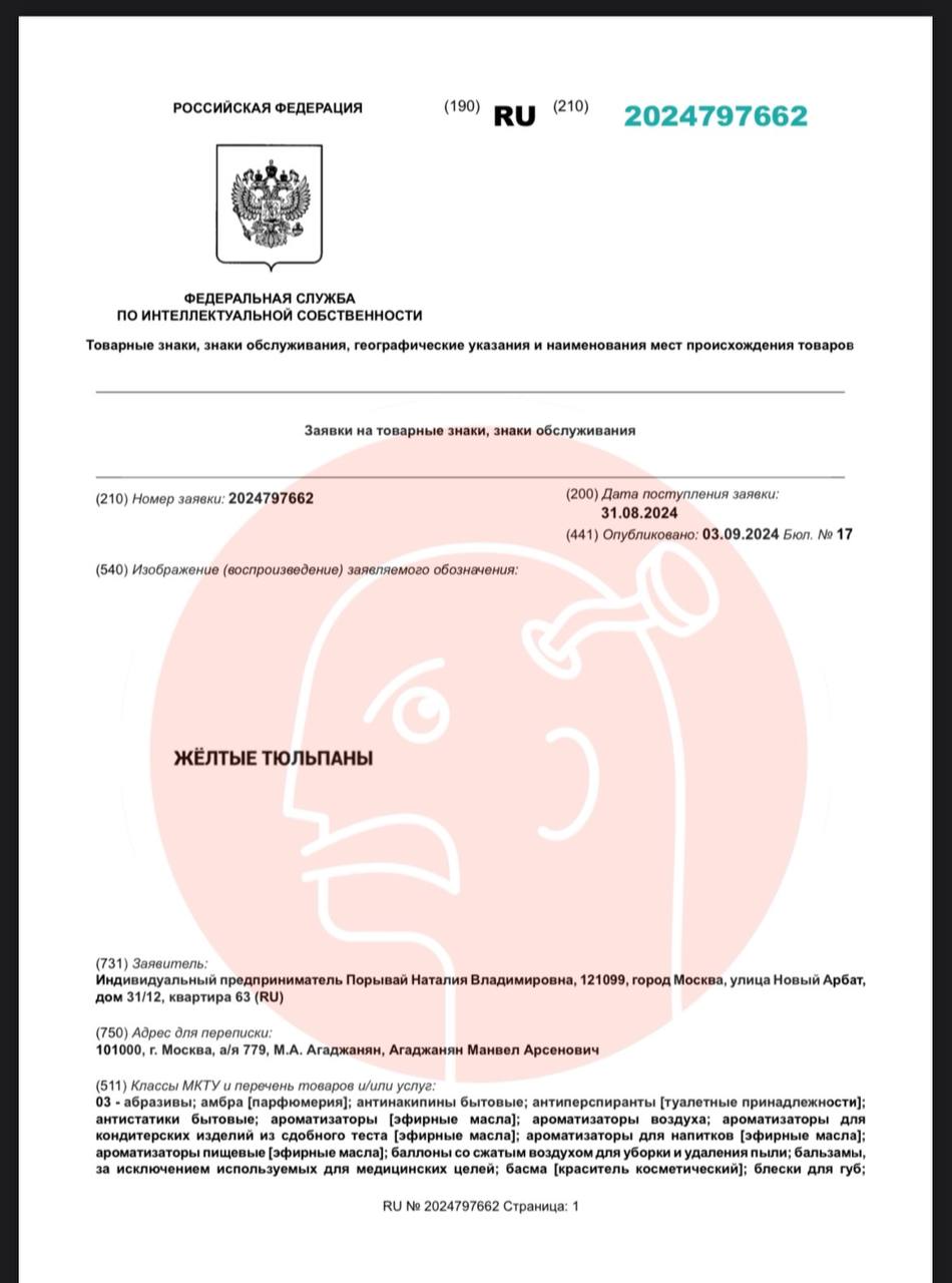 🤓 Гражданка Порывай (она же Наташа Королева) регистрирует как товарный знак свои желтые тюльпаны и псевдоним.