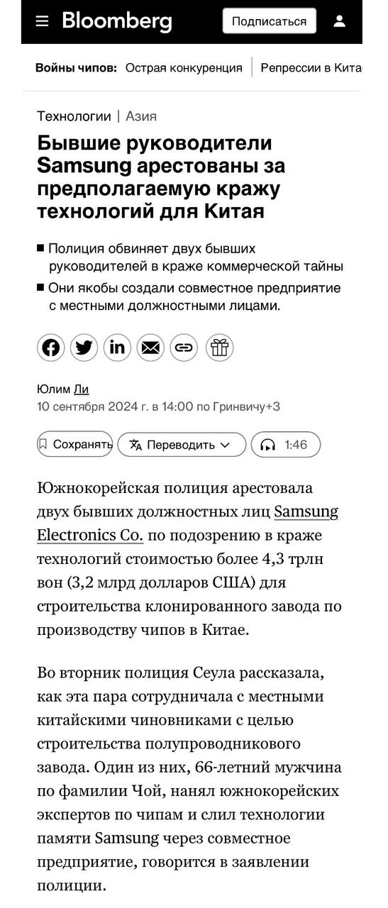 Блумберг сообщает об аресте руководства Самсунг по делу о краже технологий стоимостью более 4,3 трлн вон (3,2 млрд долларов США) для строительства клонированного завода по производству чипов в Китае.