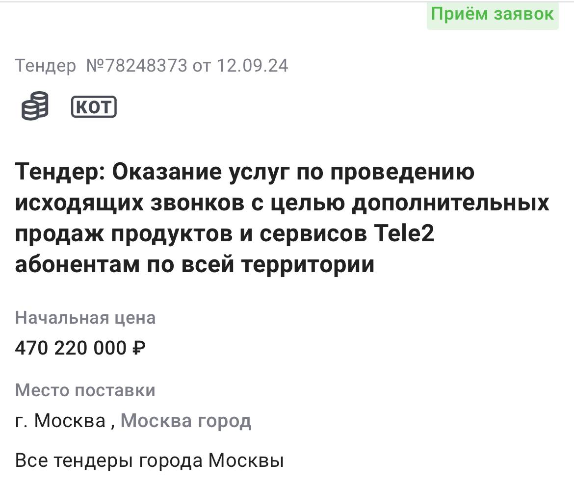 🤓 Теле2 хочет потратить на телефонный спам полмиллиарда и тендерит подрядчика на это злодеяние.
