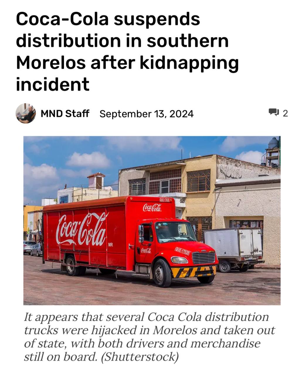 Газета El Universal сообщила, что временное прекращение распространения продукции Coca-Cola произошло после того, как четверо работников компании «были похищены и вывезены в другой регион республики с целью украсть их товары».