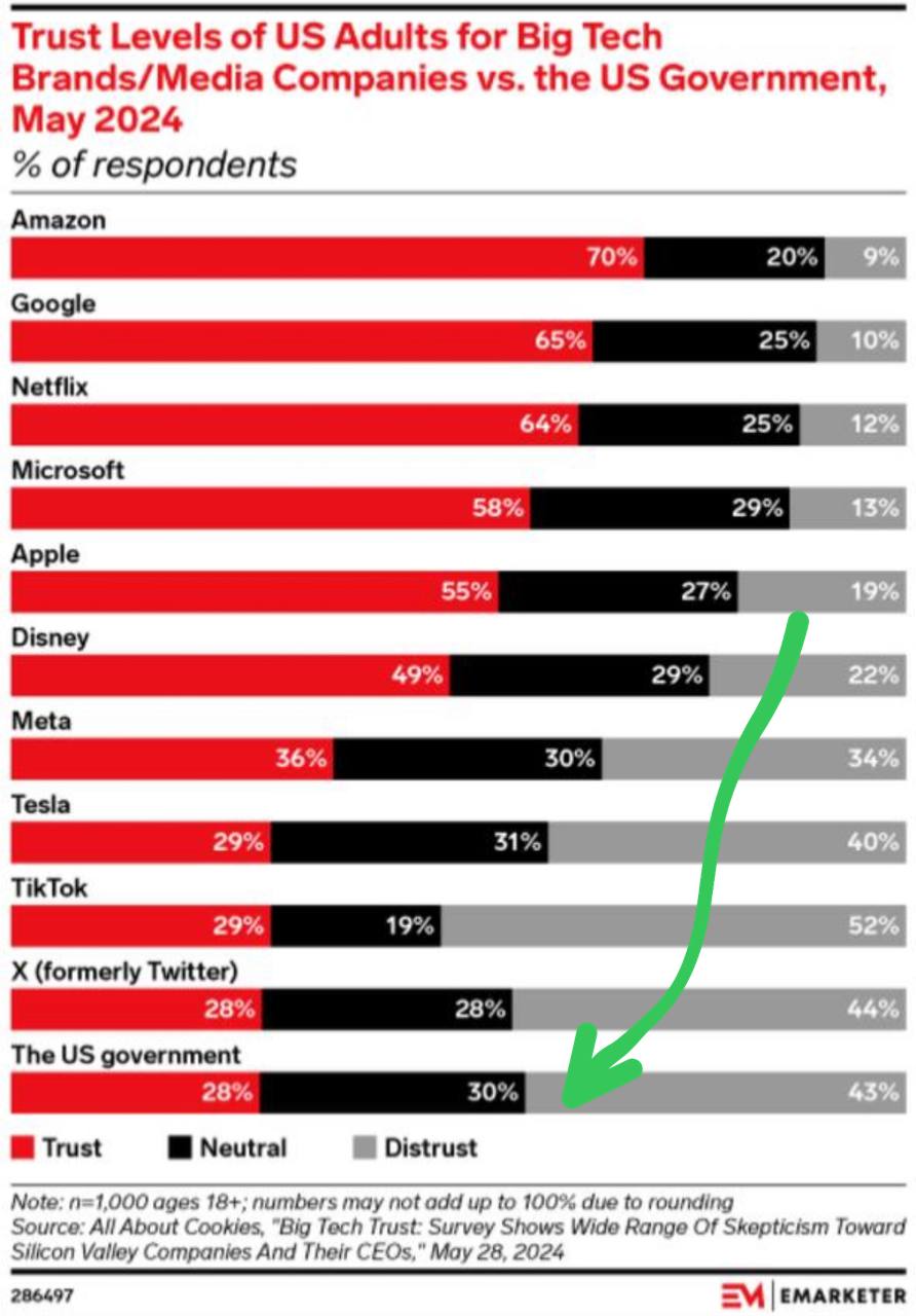 🤓 Взрослые американцы больше доверяют технологическим и медиа-компаниям, а не правительству США.