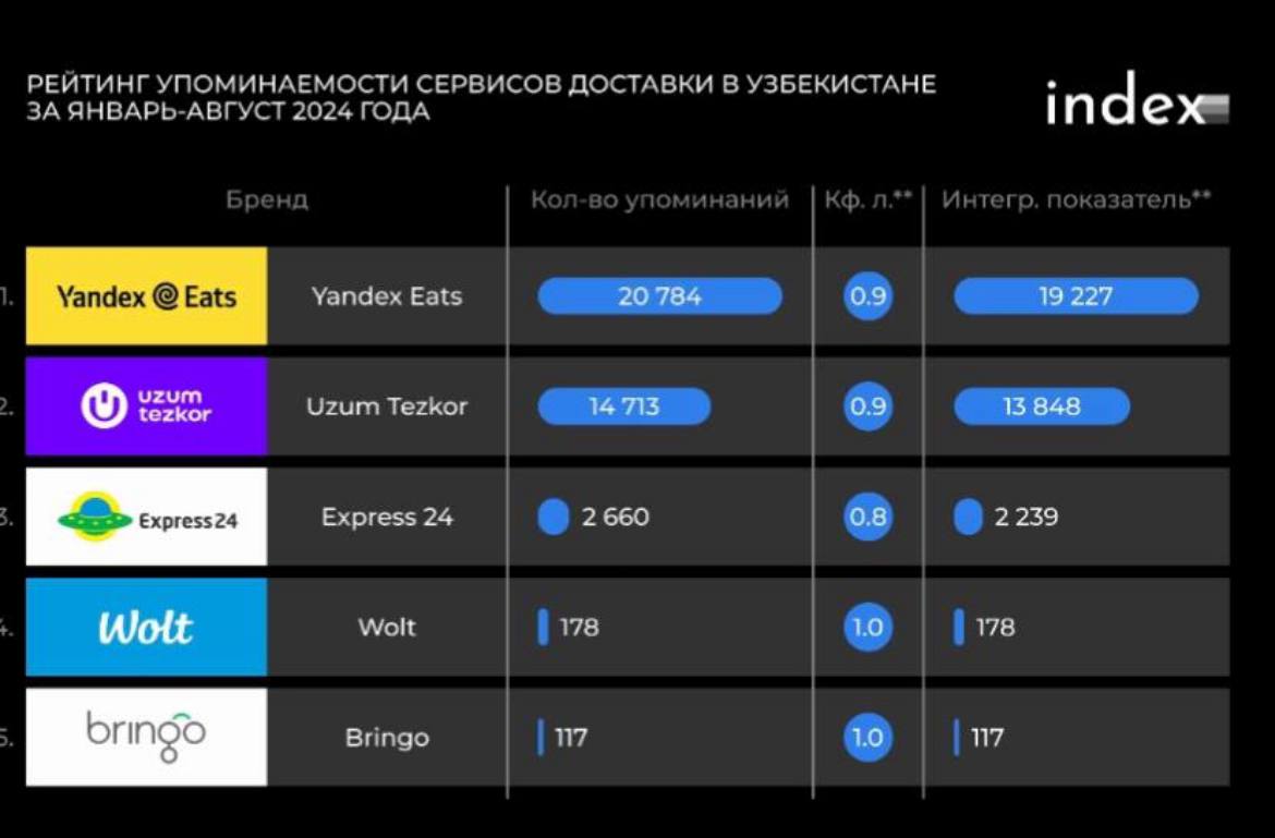 Yandex eats стал самым популярным сервисом доставки еды в Узбекистане по упоминаемости за последние пол года.