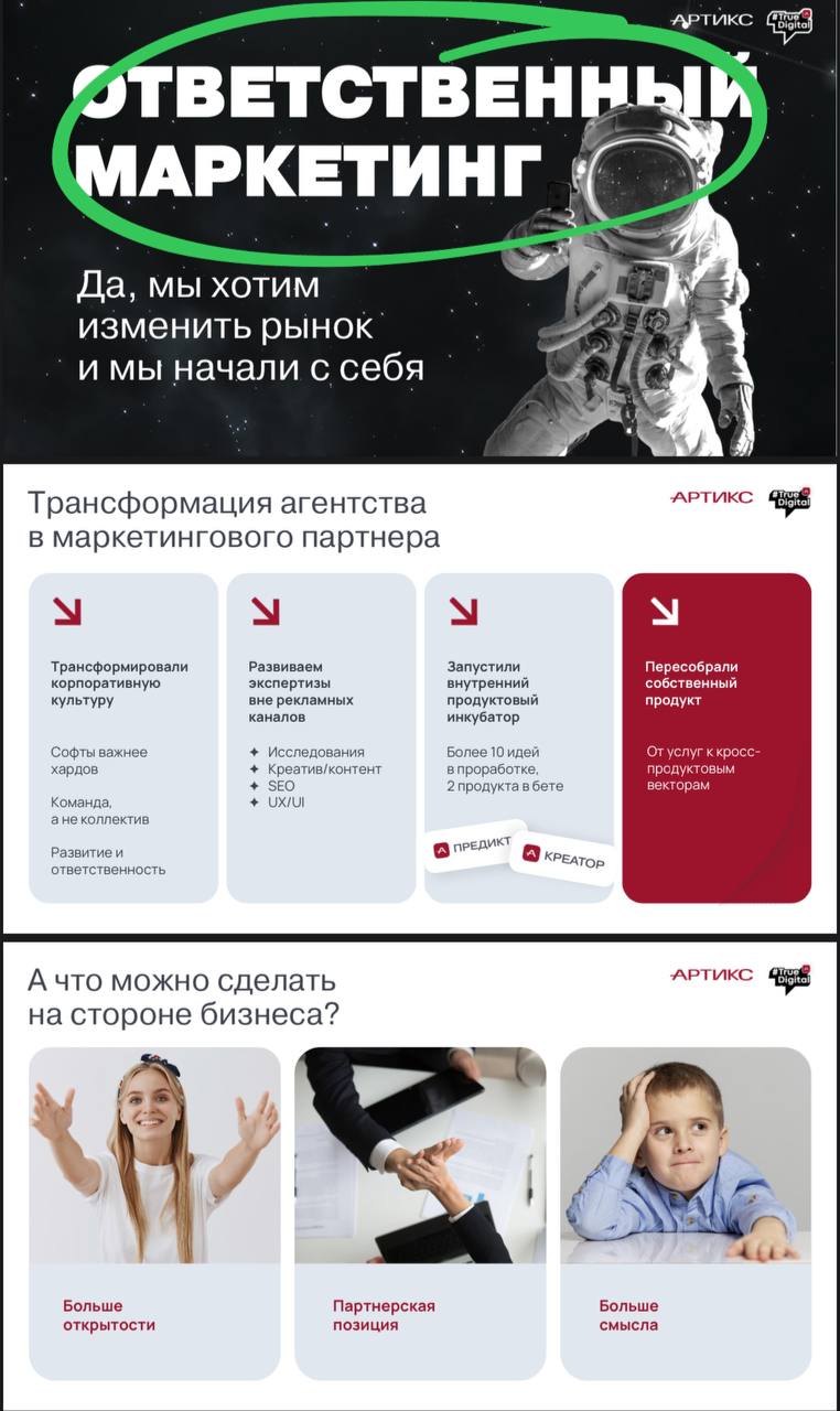 🤓 Артикс четко идентифицирует проблему негативного восприятия диджительных агентств в глазах клиента и действует на упреждение. Нормальный заход на бумаге презентаций. У нас «откликается».