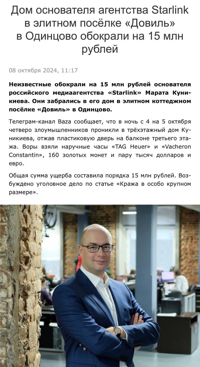 Неизвестные обокрали на 15 млн рублей основателя российского медиаагентства «Starlink» Марата Куникиева. Они забрались в его дом в элитном коттеджном посёлке «Довиль» сообщают районные СМИ Одинцово.
