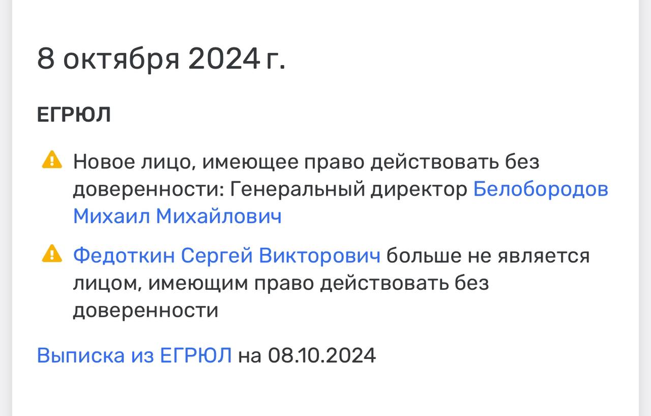 🤓 В ООО «Тубиду», входящем в RTA Agency и имеющем оборот 1,3 млрд по 23 году, сменился генеральный директор. Сергей Федоткин (действующий гендир RTA) сдал пост Белобородову Михаилу.