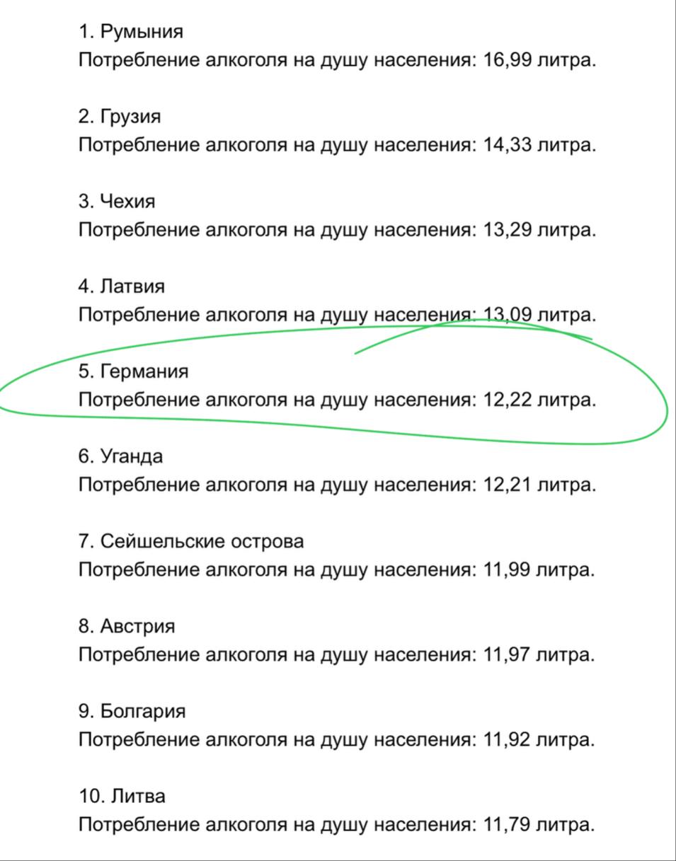 🤔 Любопытный парадокс. Несмотря на то, что более половины немцев стараются питаться здоровой пищей — Германия занимает 5-ое место в рейтинге самых пьющих стран в мире (данные Global Health Observatory).
