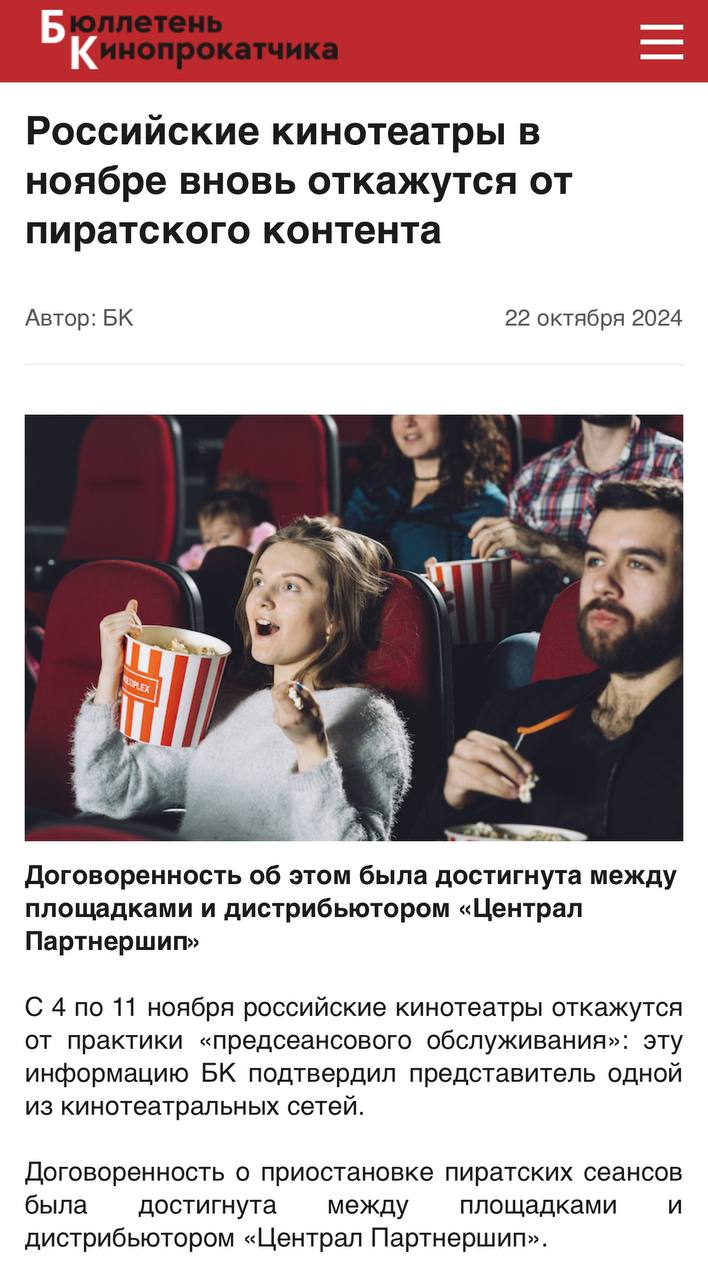Российские кинотеатры временно откажутся от демонстрации пиратских фильмов в период с 4 по 11 ноября 2024 года, сообщило издание «Бюллетень кинопрокатчика». Это позволит поддержать отечественные фильмы в прокате.