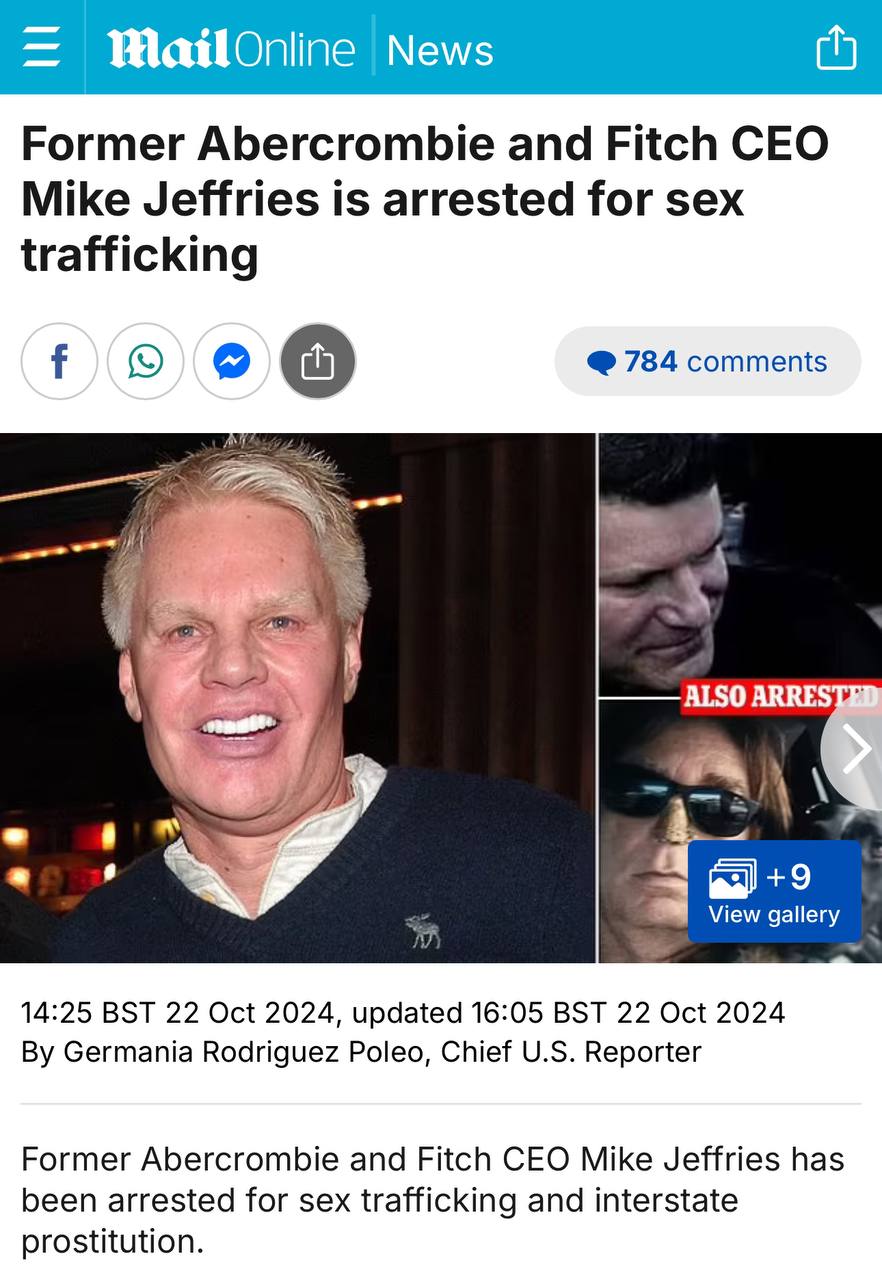 Бывший генеральный директор Abercrombie и Fitch Майк Джеффрис арестован за секс-траффикинг и межгосударственную проституцию.