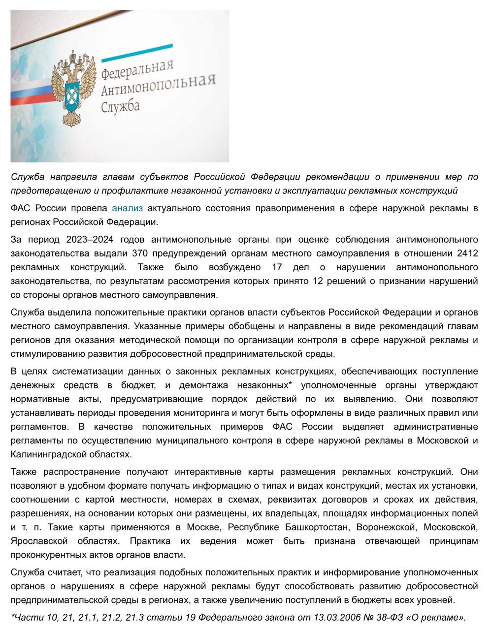 За период 2023–2024 годов антимонопольные органы при оценке соблюдения антимонопольного законодательства выдали 370 предупреждений органам местного самоуправления в отношении 2412 рекламных конструкций. Также было возбуждено 17 дел о нарушении антимонопольного законодательства, по результатам рассмотрения которых принято 12 решений о признании нарушений со стороны органов местного самоуправления.